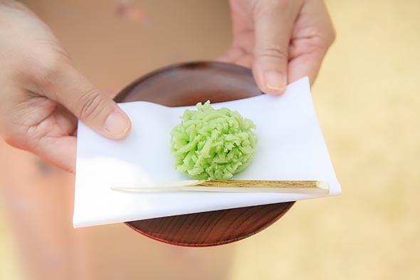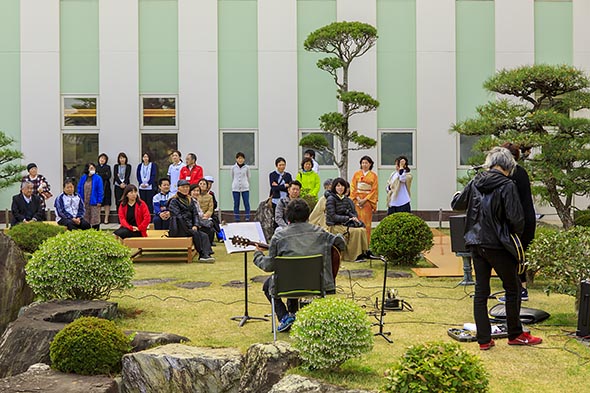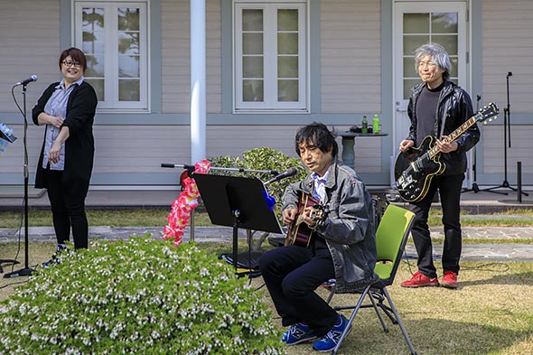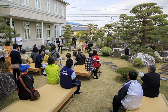 三浦副院長と管理栄養士による糖尿病ミニレクチャー、「雅椋木弦楽団」のミニライブ、理学療法士による「むくの木リラックス体操」、散歩というメニューに加え、春バージョンでは、隣接するTomorrow gardenの日本庭園に野点の席を設けて、お茶会も催されました。