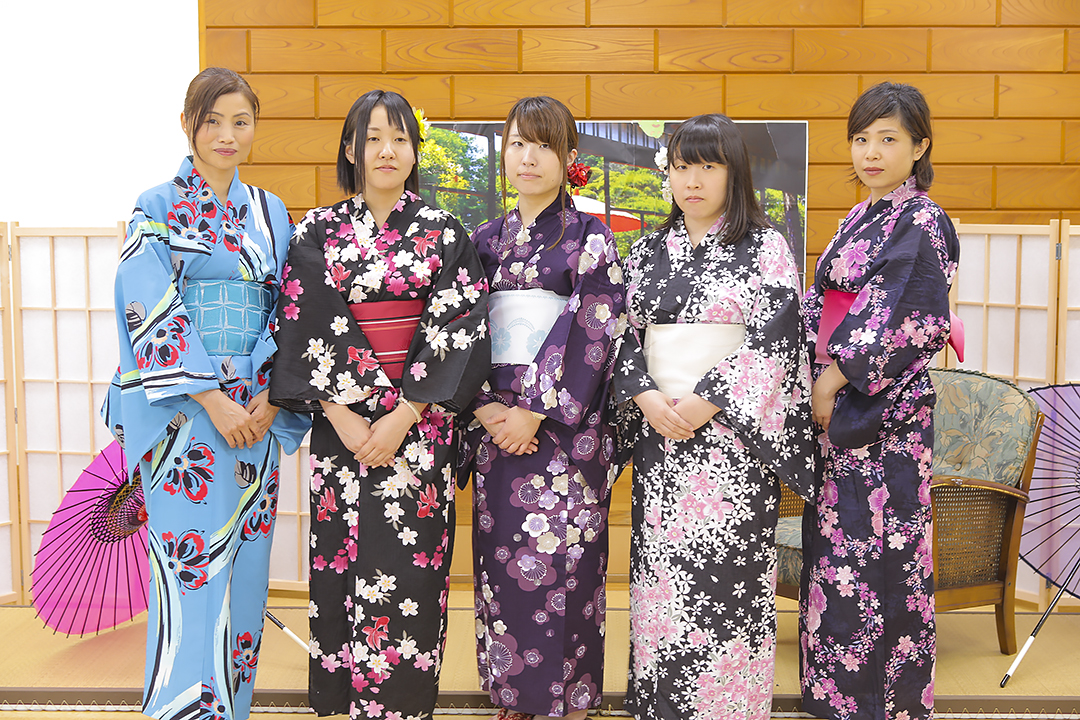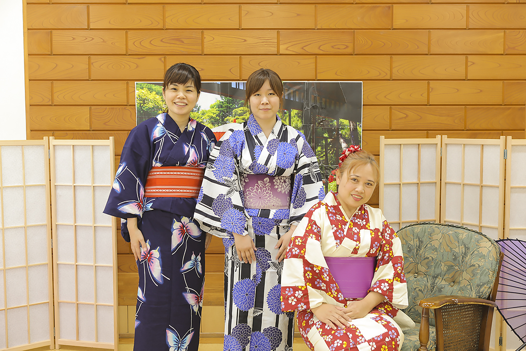写真撮影コーナーも設けました。飾っていただいているひまわりの花は、健祥会グループ創始者中村博彦の大好きだった花です。創始者は、天に向かって大きく勢いよく花開き、実がつけば頭を垂れる・・・ひまわりのそんな姿が好きでした。ひまわりのような謙虚な心で、凛とした浴衣姿をめざしましょう!」と健祥会本部長中村晃子が挨拶して、着付け教室が始まりました。