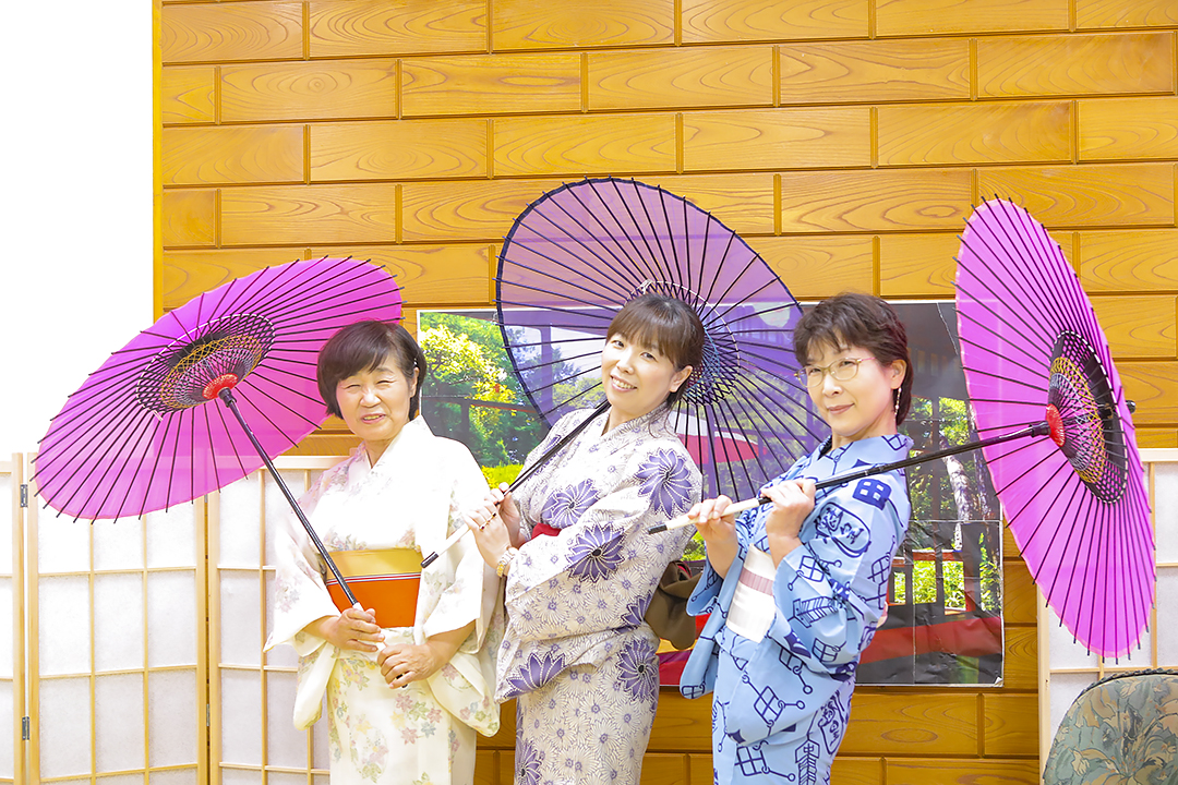 まず美容師さんから着付けの基本を学び、さっそく自分で着ることに挑戦。お隣同士で確認しながら、わいわい賑やかに頑張って、素敵な和美人がたくさんできあがりました。最後は、特設コーナーでの撮影会です。はじめは恥ずかしがってポーズをなかなか決められなかった人も、いつしか和傘を持ってニッコリ!いい笑顔のショットが撮れました。講師をして下さった皆さん、会場設営をしていただいた皆さん、素敵な時間をありがとうございました。