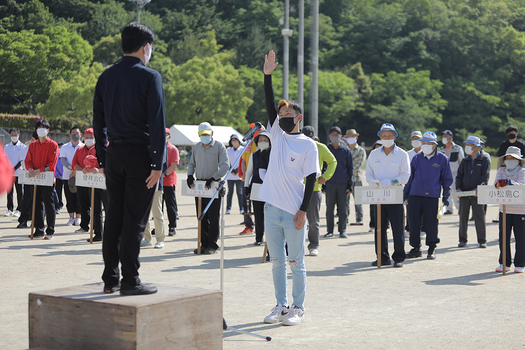 第38回大会優勝・小松島Cチームの米田陸人さんによる選手宣誓の後、原則はマスク着用とし、試合中は体調に合わせて各自の判断に委ねることなど、競技上の注意が伝えられ、開会式が終了。再びプレイできる喜びにどなたも今日の天気のような晴れやかな表情で、それぞれのコートに向かわれました。大会長も健祥会Aチームの主将として久々のプレイです。