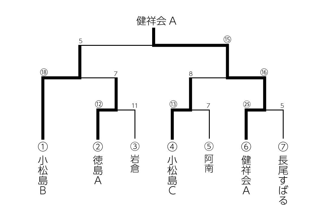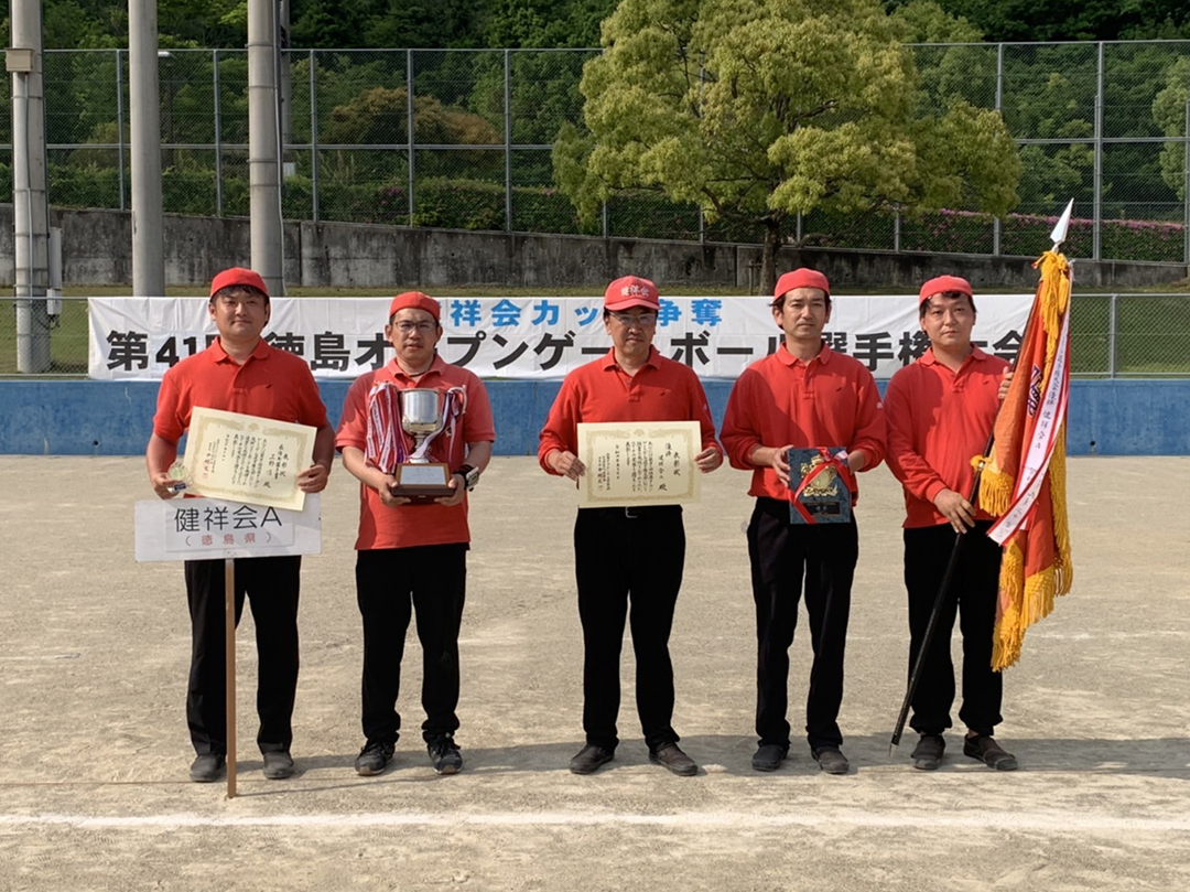 予選リーグと決勝トーナメント戦を勝ち抜いて優勝に輝いたのは、大会長率いる健祥会Aチーム(吉野川市)。前回優勝の強豪・小松島Cチーム(小松島市)を準決勝で、決勝では小松島Bチーム(小松島市)を破っての勝利でした。最優秀選手賞には健祥会Aチームの上野淳さんが選ばれました。