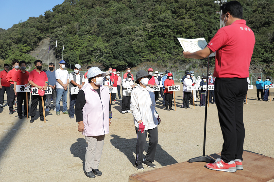 開会式では、高齢者の皆さんがいつまでも健康で意欲を持って社会に関わり続けることを願って、地元香川県の香南チームに「高齢青年チーム賞」が贈られました。平均年齢84.2歳です。