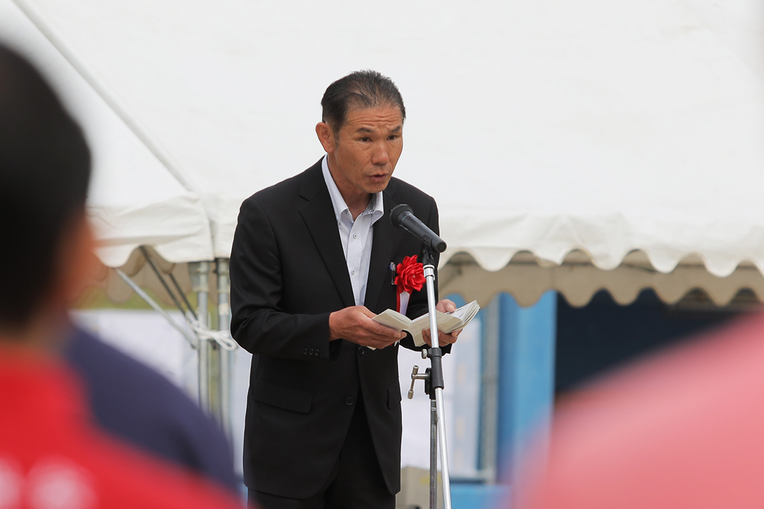 続いて第41回大会優勝健祥会Aチームの奥山達也選手による選手宣誓の後、予選リーグ戦がスタート。午後からの決勝トーナメントは、あいにくの空模様となりましたが、雨もどこ吹く風で熱戦が繰り広げられました。