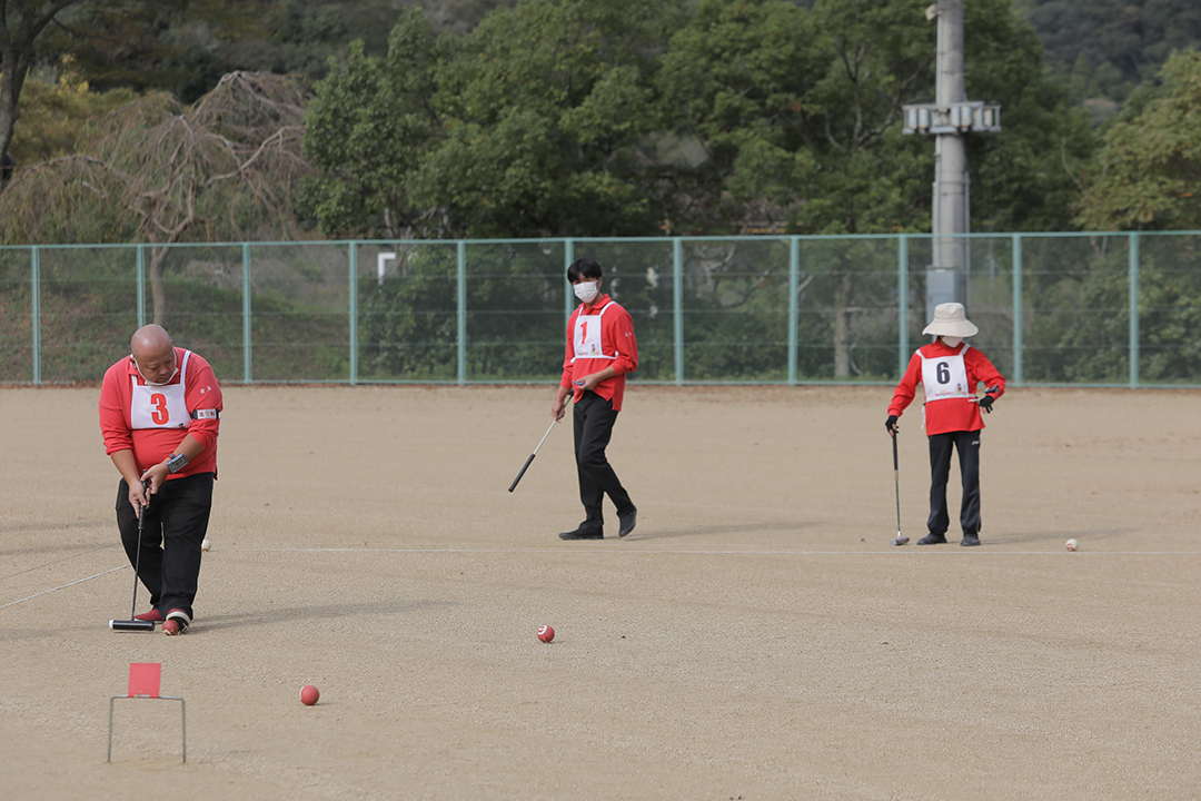 昨年優勝の健祥会Aチーム・上野淳選手が、「この地でゲートボールできることに感謝し、相手を敬い、仲間を信じ、勝負にこだわってプレイすることを誓います」と選手宣誓し、試合がスタートしました。