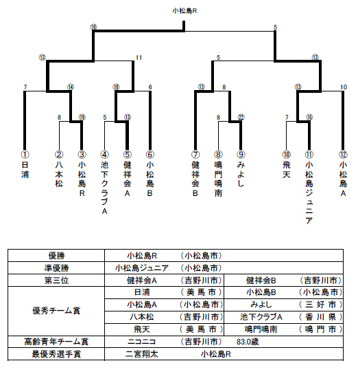 予選リーグと決勝トーナメント戦を勝ち抜いて優勝に輝いたのは、小松島Rチームです。