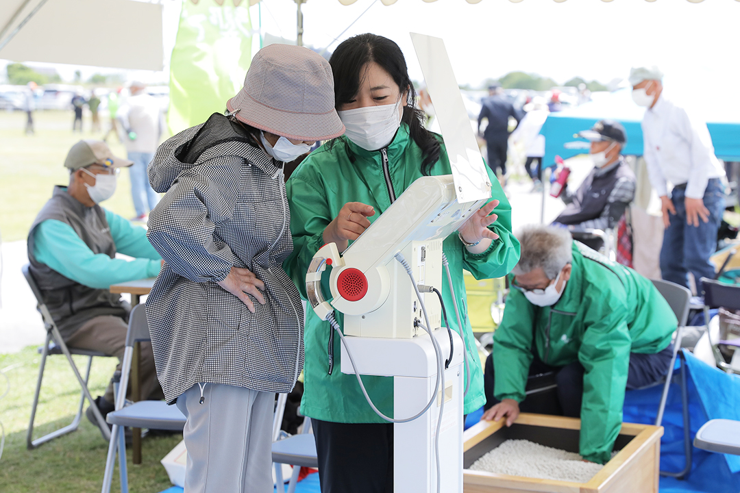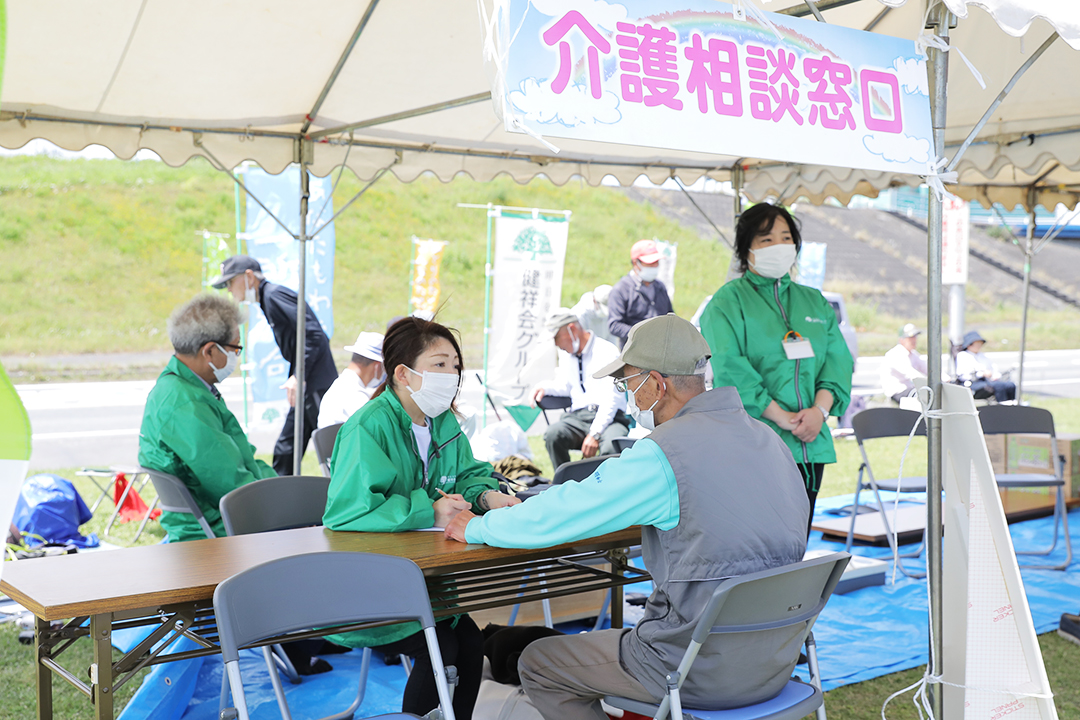 会場の一画に設けられた介護相談コーナーでは、グループの介護支援専門員が介護に関するご相談をお受けしました。健康チェックコーナーのNEO活齢君(かつとしくん)の活力年齢判定はいかがだったでしょう?「濡れない足湯」では競技の疲れを癒していただけたことと思います。
