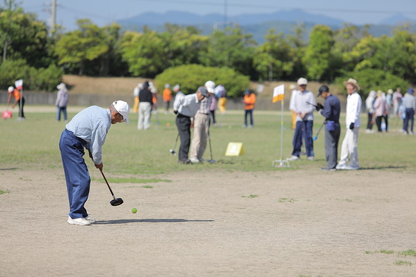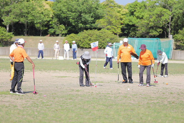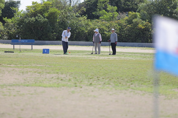 グラウンド・ゴルフは、芝生のグラウンドに設けたカゴのようなポストに、いかに少ない打数でボールを入れることができるかを競うスポーツです。ルールも簡単で、子どもから高齢者まで誰でも気軽にプレイを楽しめます。健祥会では会技であるゲートボールだけでなく、同じ生涯スポーツであるグラウンド・ゴルフについても、3つの大会(健祥会杯グラウンド・ゴルフ大会、南太平洋グラウンド・ゴルフ大会および本大会)を主催・協賛し、地域の皆様の元気を応援しています。