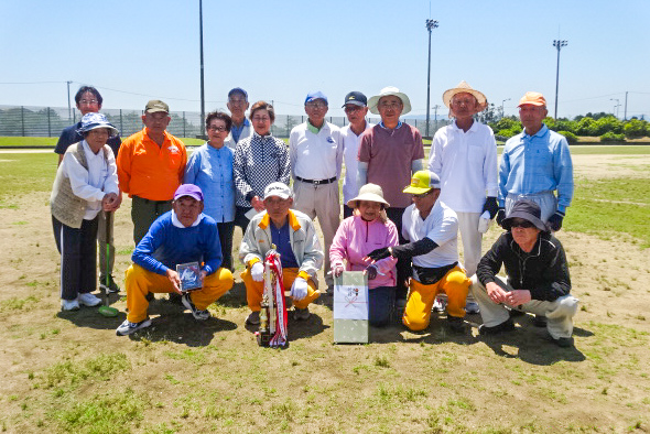 先月の健祥会杯グラウンド・ゴルフ大会に続いて、第14回健祥会ふれあい大会が小松島市和田島のJAあいさい緑地で開催されました。雲ひとつなく晴れ上がった6月2日。梅雨入りしたとは思えぬからっとさわやかな気候のもと、小松島市グラウンド・ゴルフ協会所属のグラウンド・ゴルファー136名の皆様が思い思いに、そして和やかにプレイを楽しみました。健祥会からも12名の職員が参加、デイ利用者様や地域の馴染みの皆様と笑顔を交わしながらの1日でした。