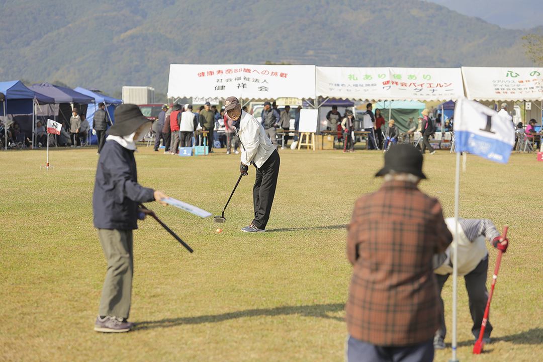 阿南市・海部郡・那賀町のグラウンド・ゴルフ協会から約400名のプレイヤーの皆様がご参加くださり、秋晴れの川のほとりで思い思いにプレイを楽しんでくださいました。