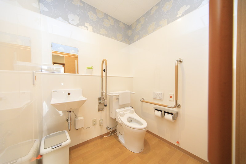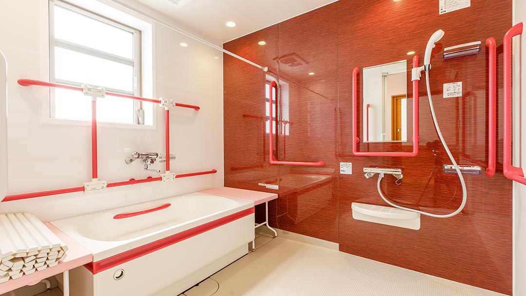 - 自立支援ユニットバスを採用。湯船も移乗台も手すりも可動式で、体格や疾病の状態に合わせてレイアウト変更が可能。自立入浴を安心快適にサポートします。手すりは視力の低下した方や白内障の方にも認識しやすい色を採用。
