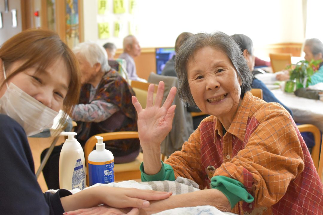 入居者様一人ひとりの生活歴や趣味に重点を置き、生け花などのレクリエーションを実施。また洗濯ものたたみなどの家事の役割を担っていただいています。自分の好きなことをしているときの表情をみるととても楽しそう。笑顔も素敵です。