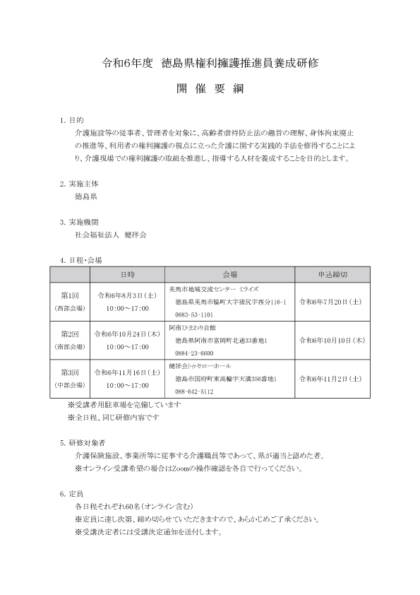 | 研修対象者 | 介護保険施設、事業所等に従事する介護職員等であって、県が適当と認めた者。 ※オンライン受講希望の場合はZoomの操作確認を各自で行ってください。 |