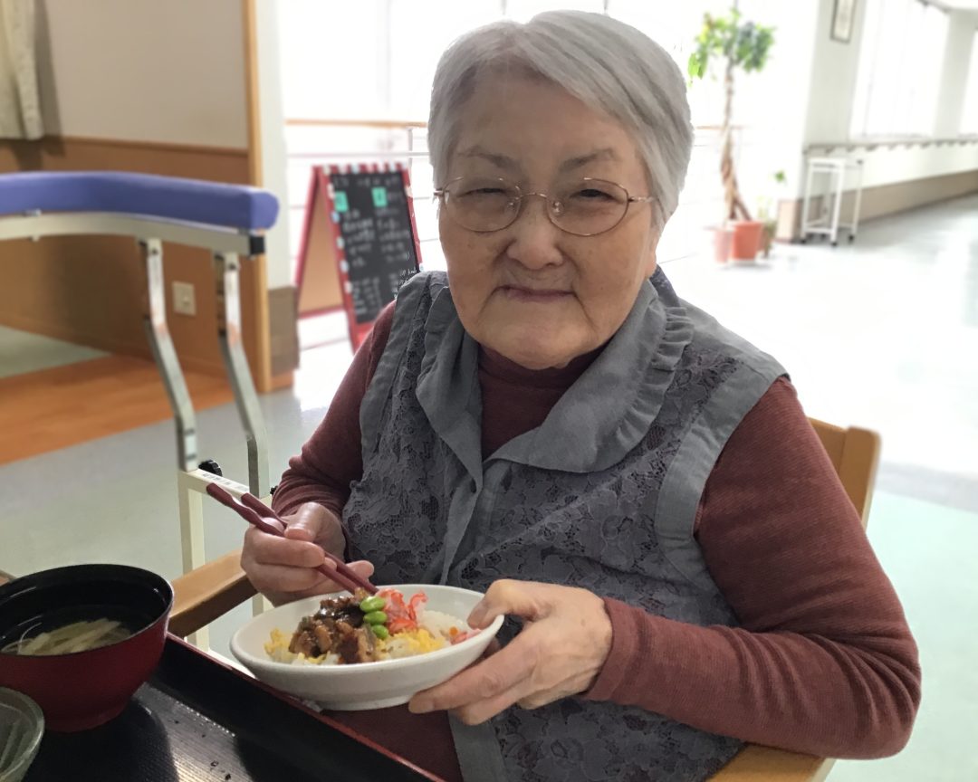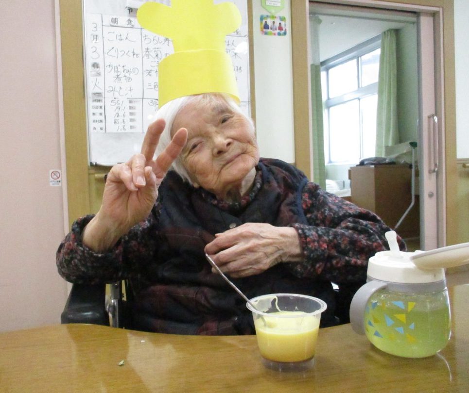 加齢とともに口腔機能が低下し、硬いものが噛みにくくなったり、飲み込む力が弱くなります。そして、介護食(いわゆる刻み食やミキサー食)になると、一層の機能低下を招きます。噛む回数を増やし、口腔体操を行い、残された能力を活かした援助を行うことで、口腔廃用症候群を予防し、常食(普通の食事)へと導きます。入所者様一人ひとりに応じた安全で適切な食事の提供をめざして、医師の指導のもと、管理栄養士を中心とした多職種協働によるチームケアを行い、「胃瘻から経口摂取」へさらには「全員普通食へ」を目標に、日々挑戦しています。