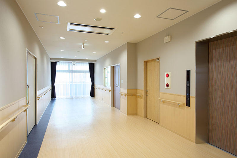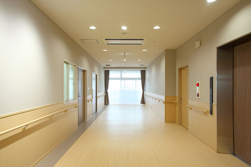 | 2階 | ユニットA(短期) 居室11室(各約13㎡)・共同生活室・調理コーナー・談話コーナー・脱衣室洗濯室・浴室・トイレ・職員コーナー他 ユニットB(入所) 居室 9室(各約13㎡)・共同生活室・調理コーナー ・談話コーナー・脱衣室洗濯室・浴室・トイレ・職員コーナー他 共用部分 談話コーナー・医務室・多目的室・介護看護職員室・共用トイレ・汚物処理室・倉庫他 |