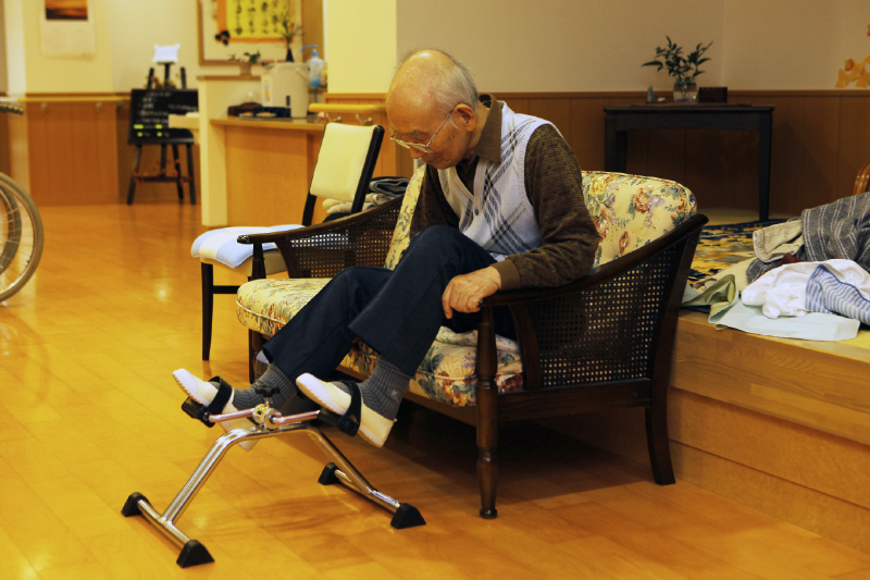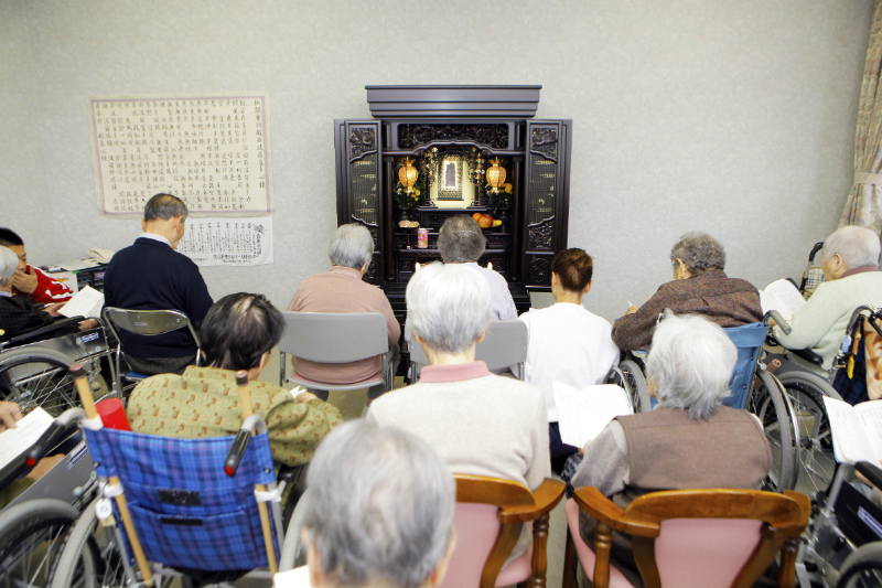 健康な高齢者の方でも睡眠が浅くなり、中途覚醒や早朝覚醒が増加します。健康生活の基盤として,調整のとれた生活リズムの継続はきわめて重要です。身体を十分動かせば食事がおいしく食べられ、適度な疲れは心地よい睡眠を促します。その生活リズム援助として、施設では、午前はラジオ体操やお念仏、学習療法、午後からは散歩やレクリエーション、いきいき体操といった活動を毎日実施しており、好みの活動を楽しみながら余暇時間を過ごしていただけるように活動の提供を行っています。