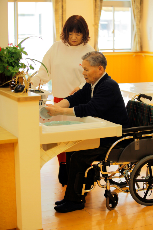 食事だけでなく、立位や歩行、整容動作など、日常の生活行為が身体機能の維持・回復にとって必要です。私たちは、利用者様が『生活をする』という視点で、残存機能を活かしながら、日常生活の中でのリハビリ(生活リハ)を提案させていただきます。基本的な動作だけではなく、食器洗いや洗濯物たたみ、買い物など、在宅でされていた活動をそのまま継続できるように、また自分からしたいと思えるような支援と、それが可能な環境を提供させていただきます。メリハリある生活を習慣化し、利用者様が笑顔で過ごせる施設づくりを目標に私たちは日々業務に励んでいます。