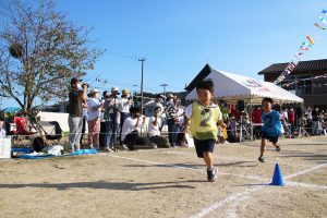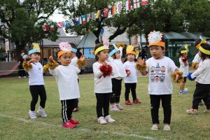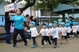 前日の雨も上がり、10月8日、こまつしま健祥会認定こども園では第16回人間力づくり運動会が開催されました。まず、0・1・2歳児、次に3・4・5歳児と、時間を分けての開催です。3・4・5歳児の時間には、健祥会グループ理事長中村太一も駆けつけ、開会式が行われました。