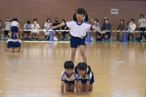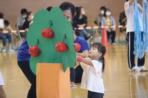 「心を一つに、競い合い、助け合い、一人ひとりが輝く運動会、頑張ります」と5歳児のかわいい宣誓でプログラムがスタート。芝生の園庭で4・5歳児は裸足でのびのび競技します。全員体操に続いて、マットや跳び箱、鉄棒をつかった競技や、組み体操、徒競走、愛らしいお遊戯など、それぞれの発達に応じた9つのプログラムをどの子も精一杯頑張りました。跳び箱8段の成功に大きな歓声があがったり、リレーは胸が熱くなるほどの白熱ぶりでフィナーレを飾りました。