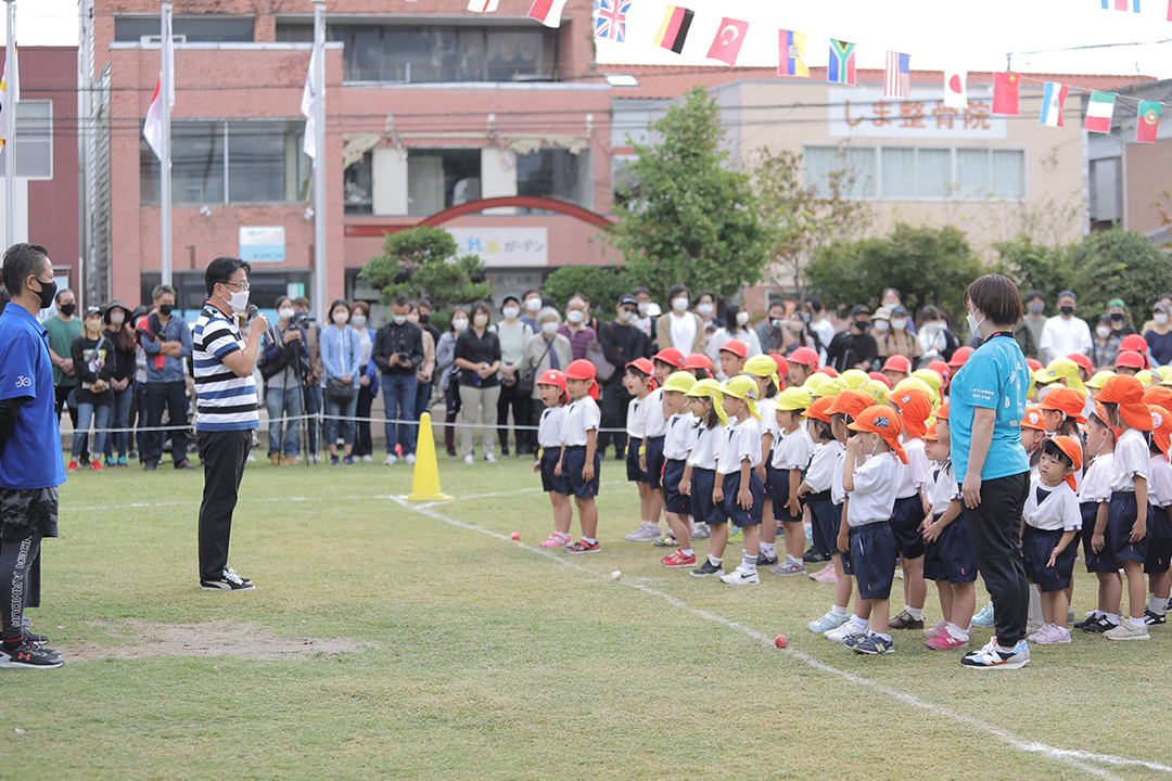前日の雨も上がり、10月8日、こまつしま健祥会認定こども園では第16回人間力づくり運動会が開催されました。まず、0・1・2歳児、次に3・4・5歳児と、時間を分けての開催です。3・4・5歳児の時間には、健祥会グループ理事長中村太一も駆けつけ、開会式が行われました。