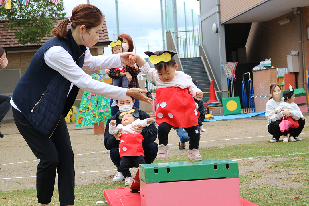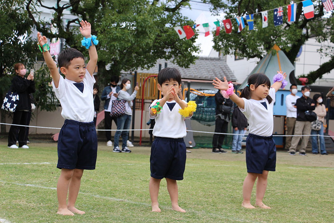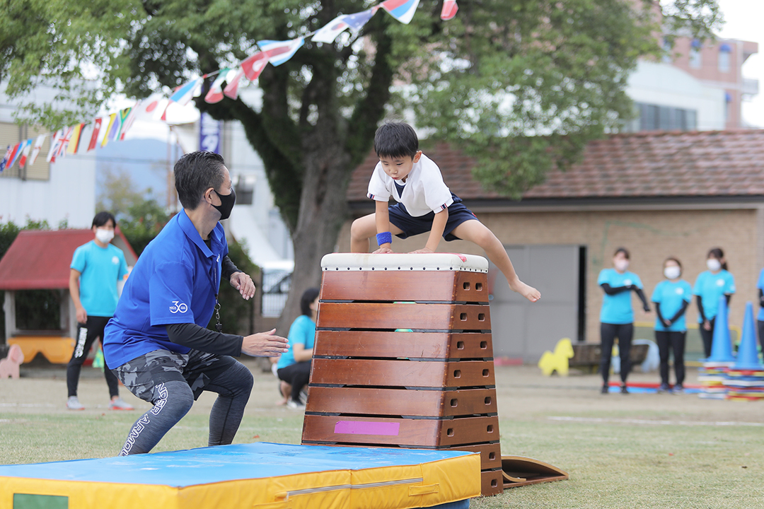 「心を一つに、競い合い、助け合い、一人ひとりが輝く運動会、頑張ります」と5歳児のかわいい宣誓でプログラムがスタート。芝生の園庭で4・5歳児は裸足でのびのび競技します。全員体操に続いて、マットや跳び箱、鉄棒をつかった競技や、組み体操、徒競走、愛らしいお遊戯など、それぞれの発達に応じた9つのプログラムをどの子も精一杯頑張りました。跳び箱8段の成功に大きな歓声があがったり、リレーは胸が熱くなるほどの白熱ぶりでフィナーレを飾りました。
