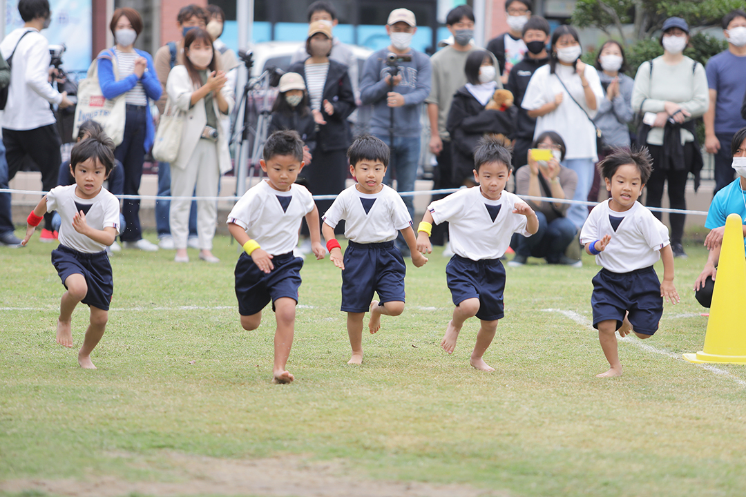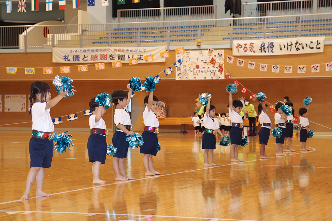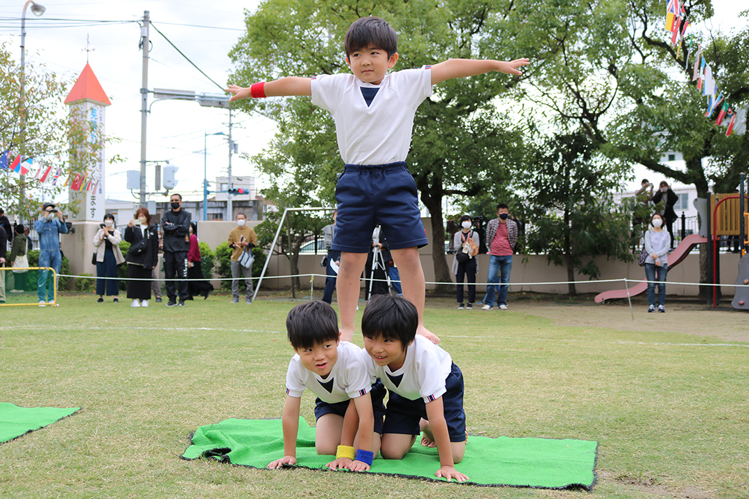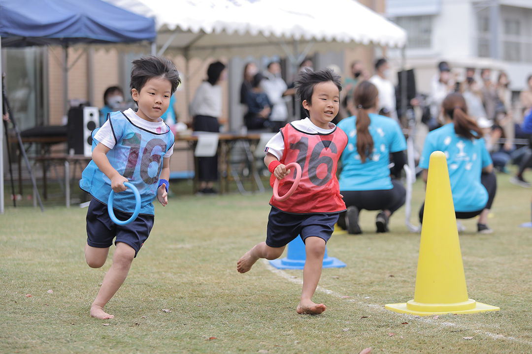 運動会は、子どもたちはもちろん保護者の皆様にとっても、一年中でもっとも楽しみな行事のひとつ。体操教室で頑張ってきた跳び箱や鉄棒、組体操やかけっこなどに取り組む姿や、小さな社会である園の中での成長ぶりをみていただく大切な機会です。依然コロナ禍は続いていますが、年齢別に時間を分けて密を避け、検温・消毒などを徹底した上で開催しました。心苦しい限りでしたが保護者の参加は昨年同様、一家族二人までに限らせていただきました。
