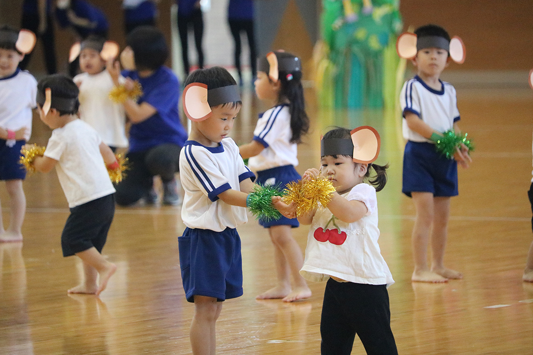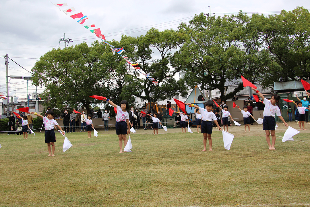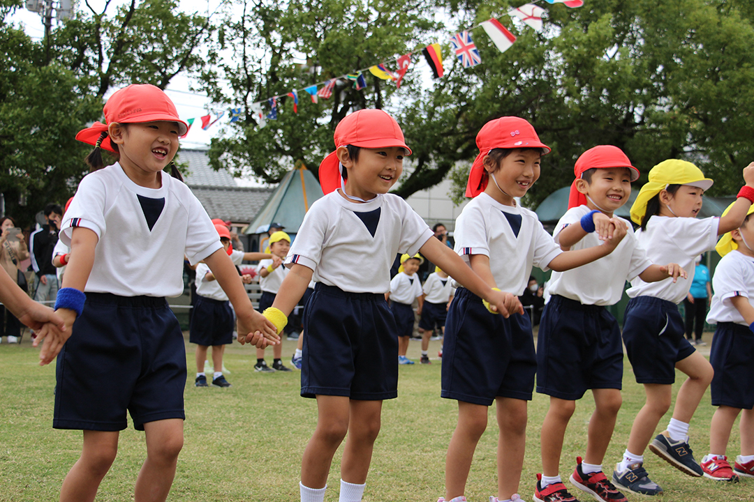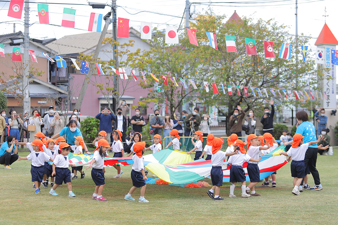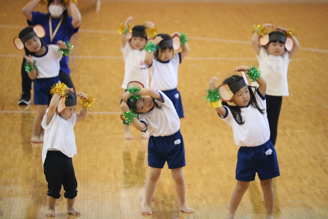運動会は、子どもたちはもちろん保護者の皆様にとっても、一年中でもっとも楽しみな行事のひとつ。体操教室で頑張ってきた跳び箱や鉄棒、組体操やかけっこなどに取り組む姿や、小さな社会である園の中での成長ぶりをみていただく大切な機会です。依然コロナ禍は続いていますが、年齢別に時間を分けて密を避け、検温・消毒などを徹底した上で開催しました。心苦しい限りでしたが保護者の参加は昨年同様、一家族二人までに限らせていただきました。