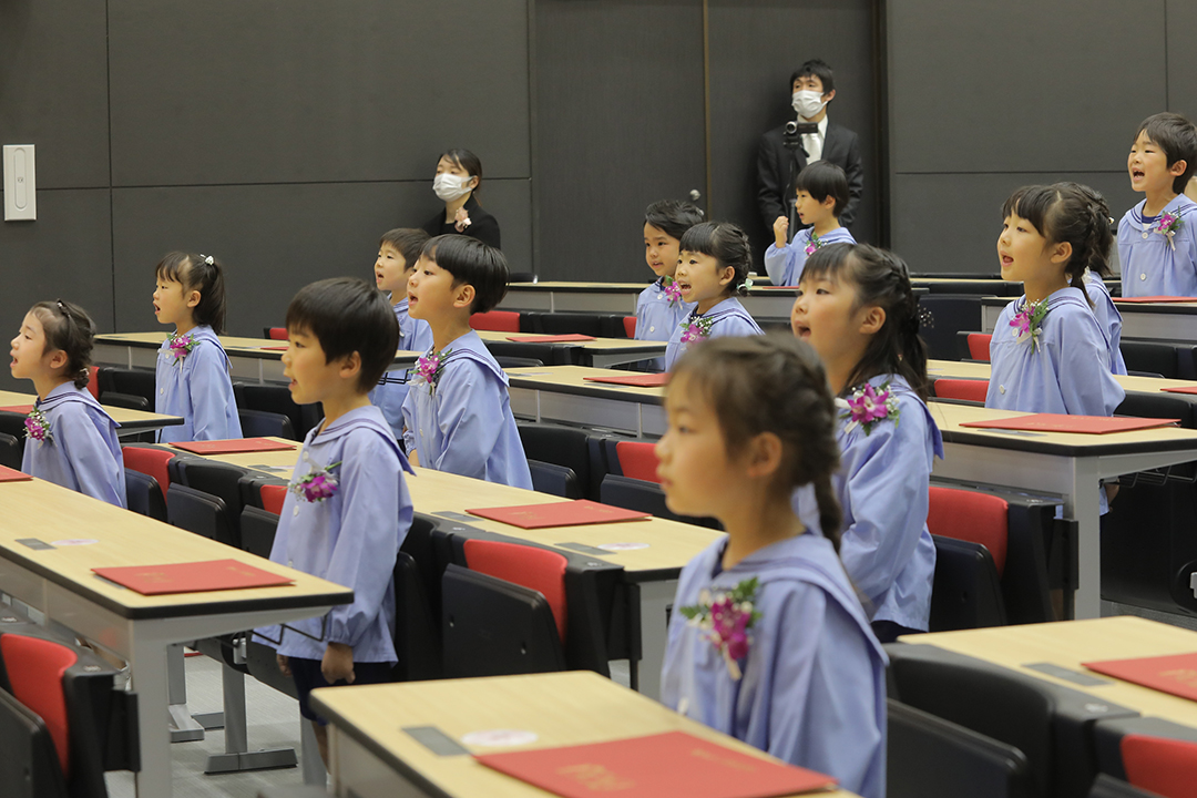 街角のそこここで桜の花が春を告げる中、3月18日、25日の両日、健祥会グループ4つの認定こども園で卒園式が行われました。とくしま健祥会認定こども園とこまつしま健祥会認定こども園は自園で、育英認定こども園と青嵐認定こども園は、健祥会グループ本部の健祥会トゥモローホールを会場に行われました。コロナ感染症の蔓延は下火になっていますが、いずれも来賓や地域の方のご招待は控え、保護者の参加も園児一人にお二人までに限定。「新型コロナウイルス感染症対策の基本的対処方針」の変更に関する文部科学省からの通知に準じて、マスクについては園児は原則、着用しない、保護者には着用いただくこととしました。