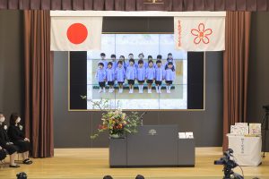 舞台のスクリーンに在園児のお別れの歌とメッセージが流れ、卒園児たちが歌とともに園での思い出を語ります。最後は「二宮金次郎」「仰げば尊し」や園歌「あしたを呼びに行こう」を元気に歌いました。笑顔あり、涙ありの卒園式、たくさんのありがとうを胸に新しい明日に向かって出発です。