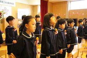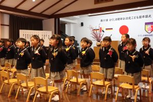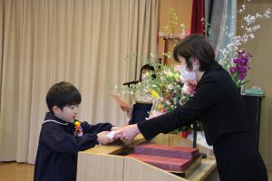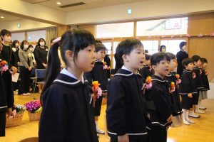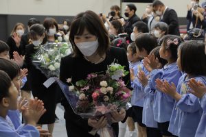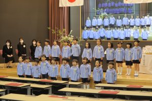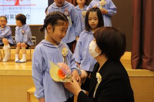 「この3年間、コロナウイルスのためにマスクをしなければならなかったり、運動会やクリスマス会も家族みんなに来てもらえなかったり、辛い思い、寂しい思いをしてきましたね。でも、今、皆さんの明るくたくましい姿をみて、コロナに鍛えられ、大変だったことが力になったんだな、小学校に行っても心配ないなと思っています。