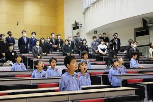 元気な国歌斉唱ではじまった卒園式。20名の卒園児たちは健祥会トゥモローホールの階段席に姿勢良く座って式典に臨み、一人ひとりステージに上がって園長より卒園証書を受け取りました。