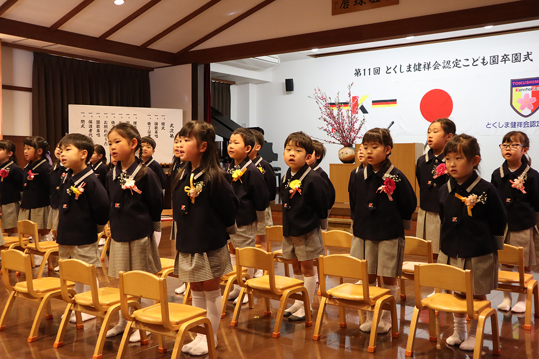 街角のそこここで桜の花が春を告げる中、3月18日、25日の両日、健祥会グループ4つの認定こども園で卒園式が行われました。とくしま健祥会認定こども園とこまつしま健祥会認定こども園は自園で、育英認定こども園と青嵐認定こども園は、健祥会グループ本部の健祥会トゥモローホールを会場に行われました。コロナ感染症の蔓延は下火になっていますが、いずれも来賓や地域の方のご招待は控え、保護者の参加も園児一人にお二人までに限定。「新型コロナウイルス感染症対策の基本的対処方針」の変更に関する文部科学省からの通知に準じて、マスクについては園児は原則、着用しない、保護者には着用いただくこととしました。