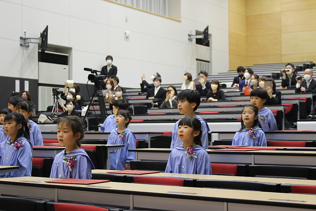 元気な国歌斉唱ではじまった卒園式。20名の卒園児たちは健祥会トゥモローホールの階段席に姿勢良く座って式典に臨み、一人ひとりステージに上がって園長より卒園証書を受け取りました。