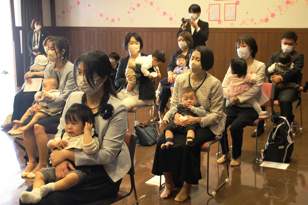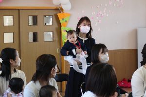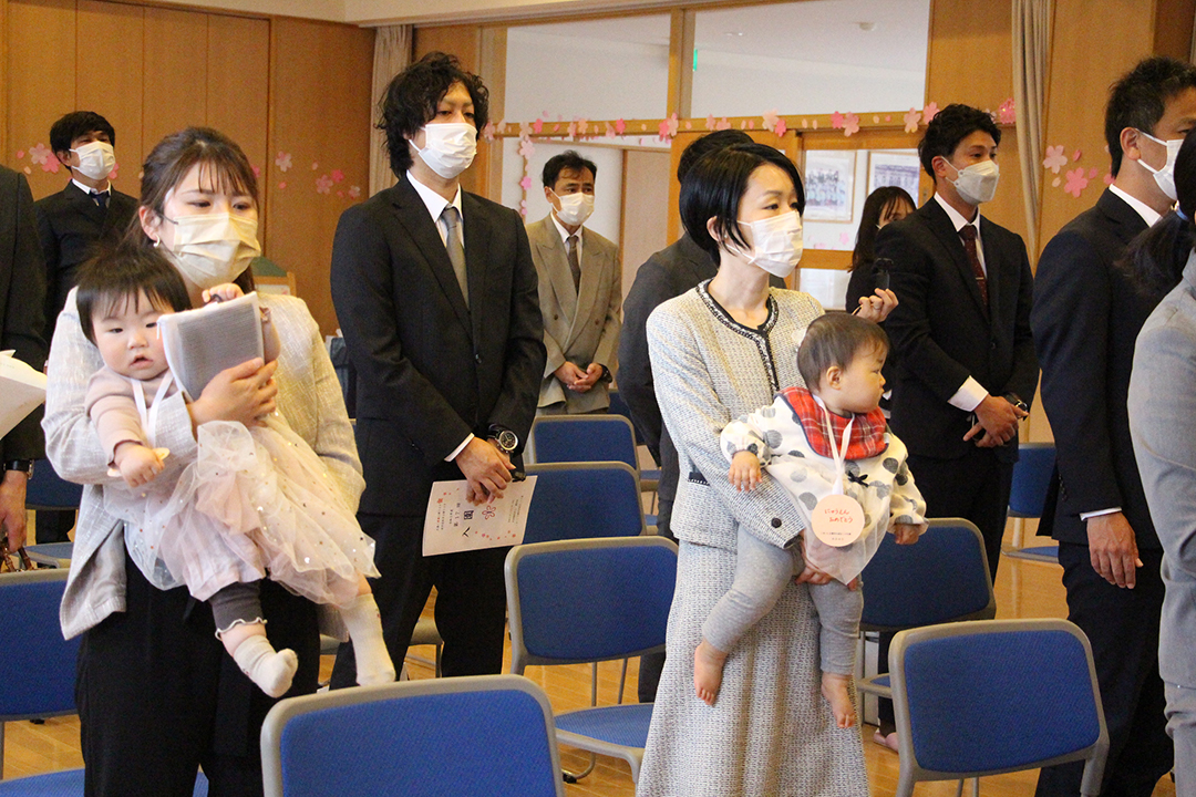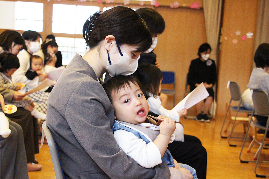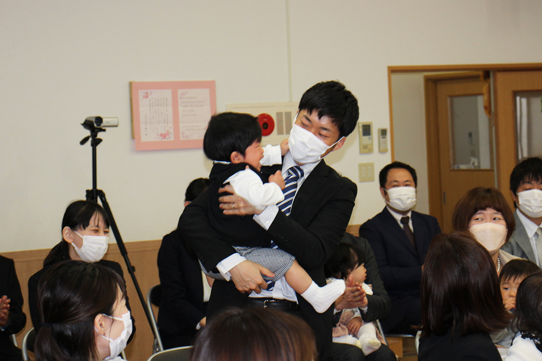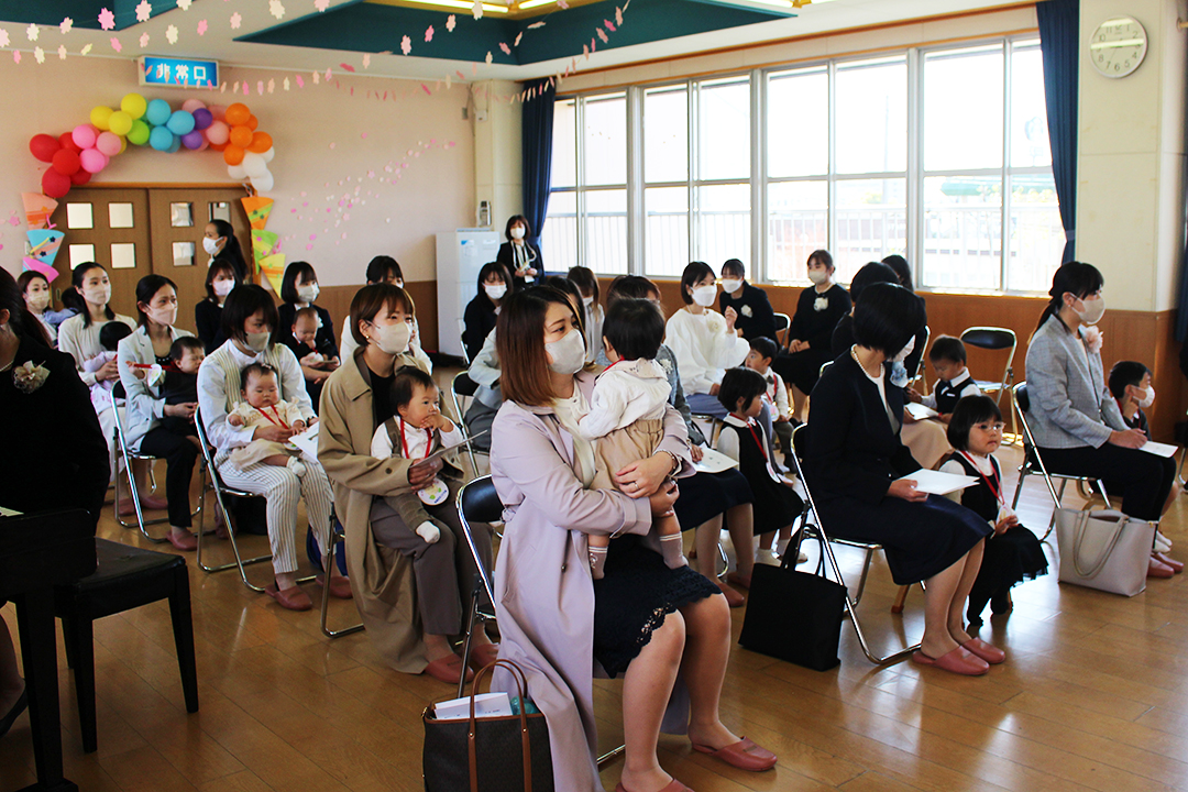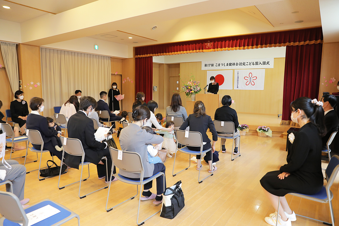 こまつしま健祥会認定こども園第17回入園式には、新しく仲間入りする0歳児から4歳児まで21名のお友だちが元気に登園しました。在園児の列席は昨年同様見合わせましたが、保護者は園児一人にお二人までとし、健康チェックとマスク着用にご協力いただいての開催です。