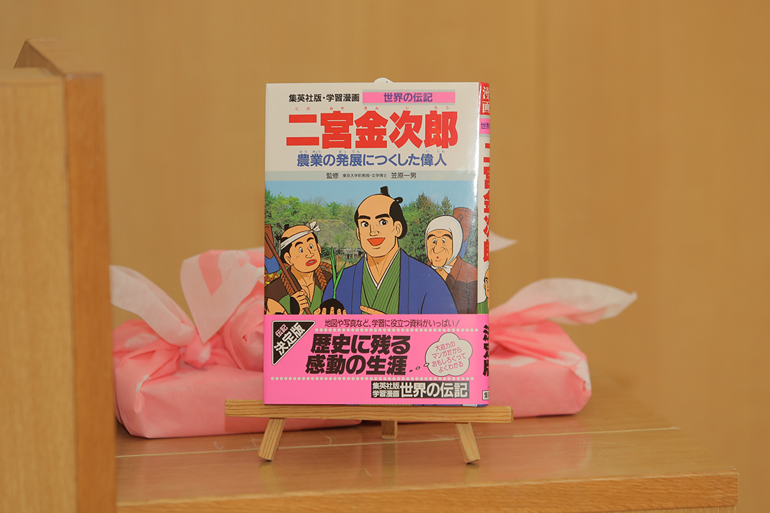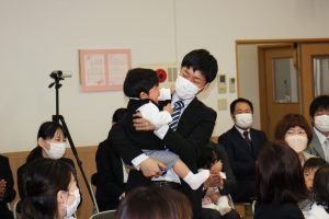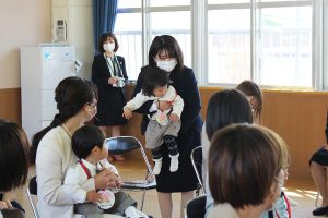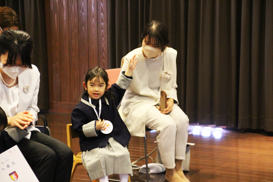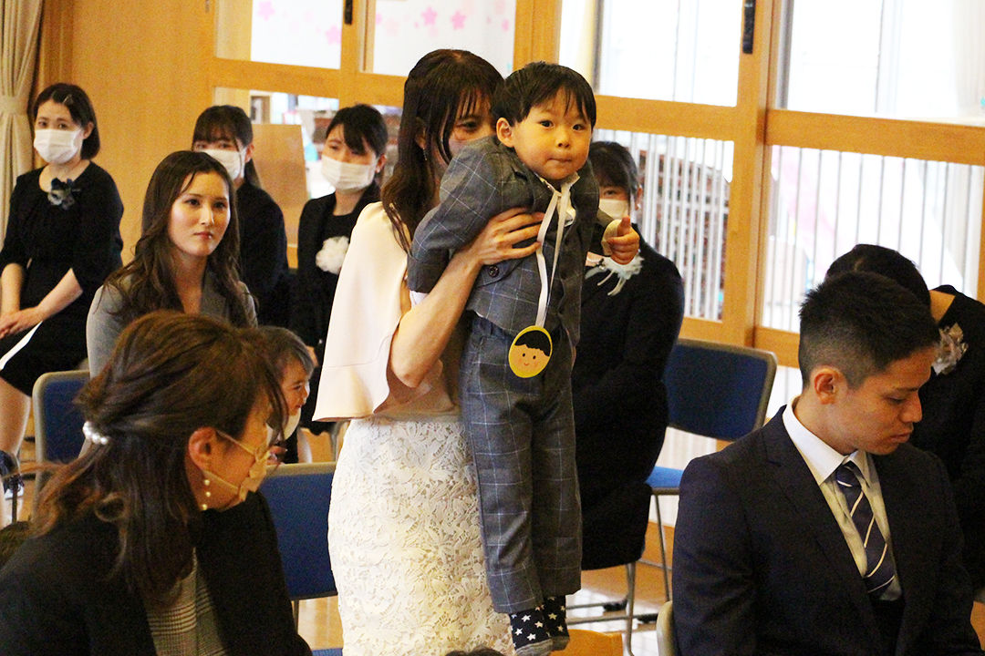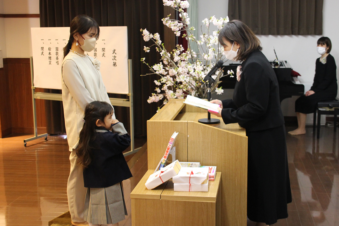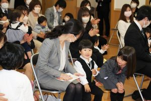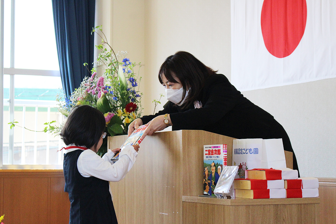 職員紹介ののち、園歌「あしたを呼びに行こう!」を斉唱。続いて理事長から、ご家庭で親子でともに読んでいただきたい一冊として、孝行・勤勉・学問の心を記した二宮金次郎の絵本が入園児に贈られました。