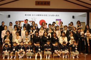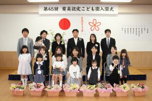 お遊戯室に並んだ新入園児たちの胸には、受付でかけてもらった手作りのペンダントが揺れています。式典では国歌斉唱の後、一人ひとりが紹介され、上手にお返事。続いて健祥会グループ理事長中村太一がご挨拶申し上げました。