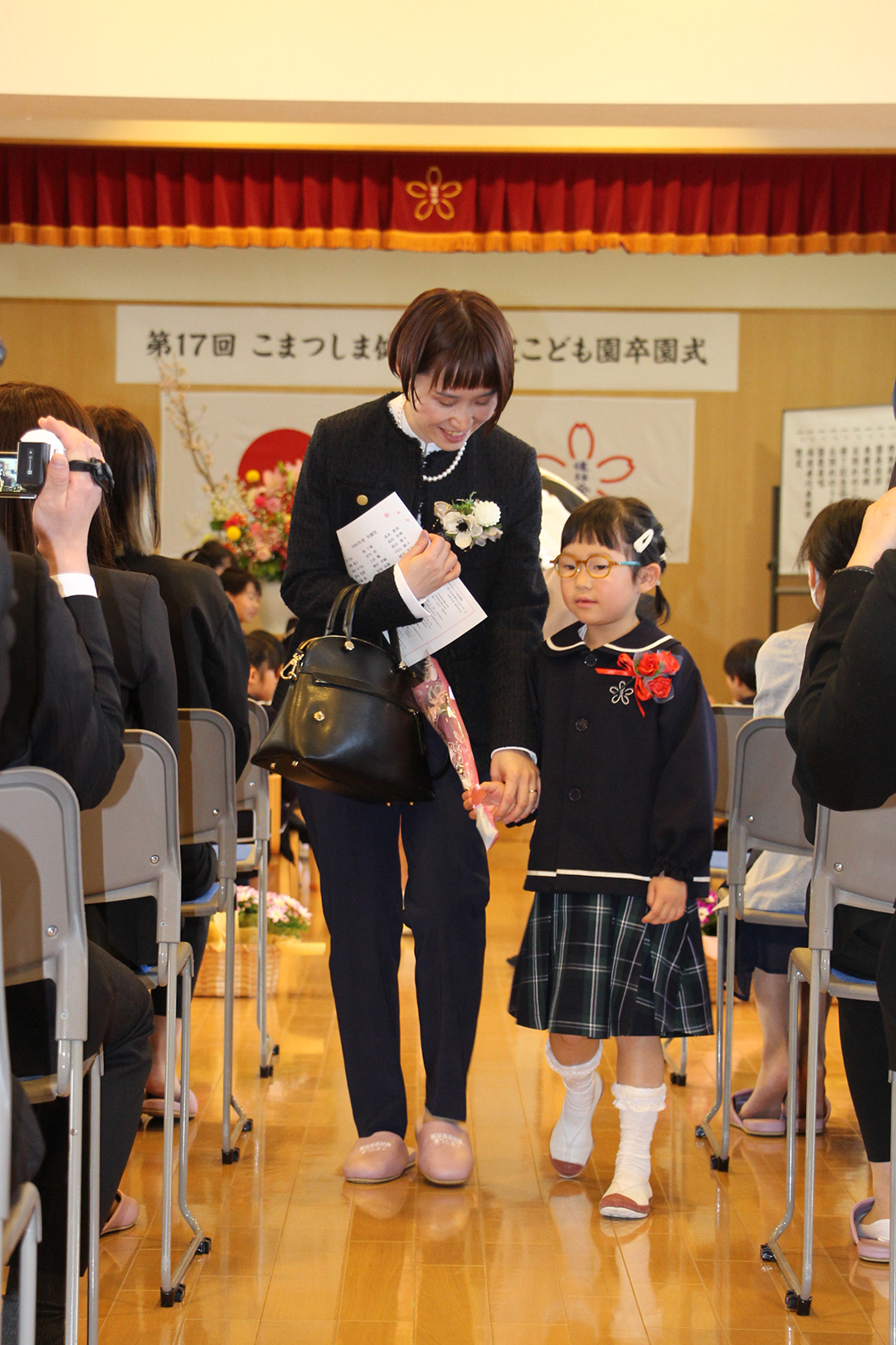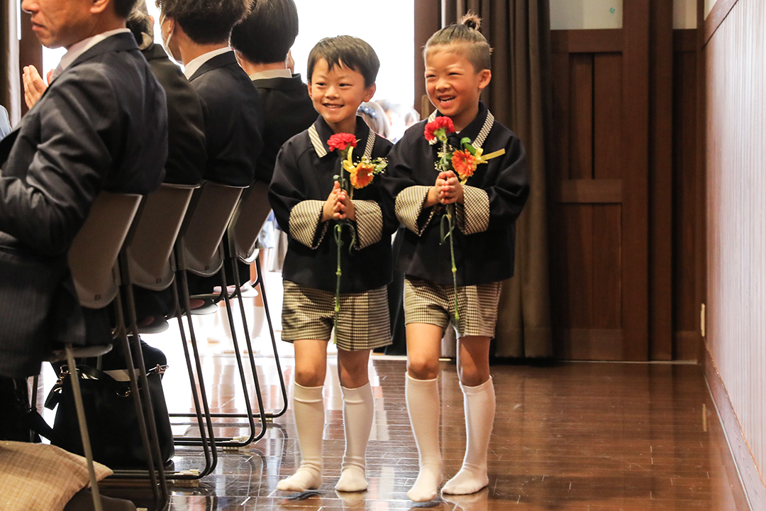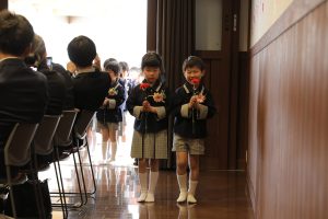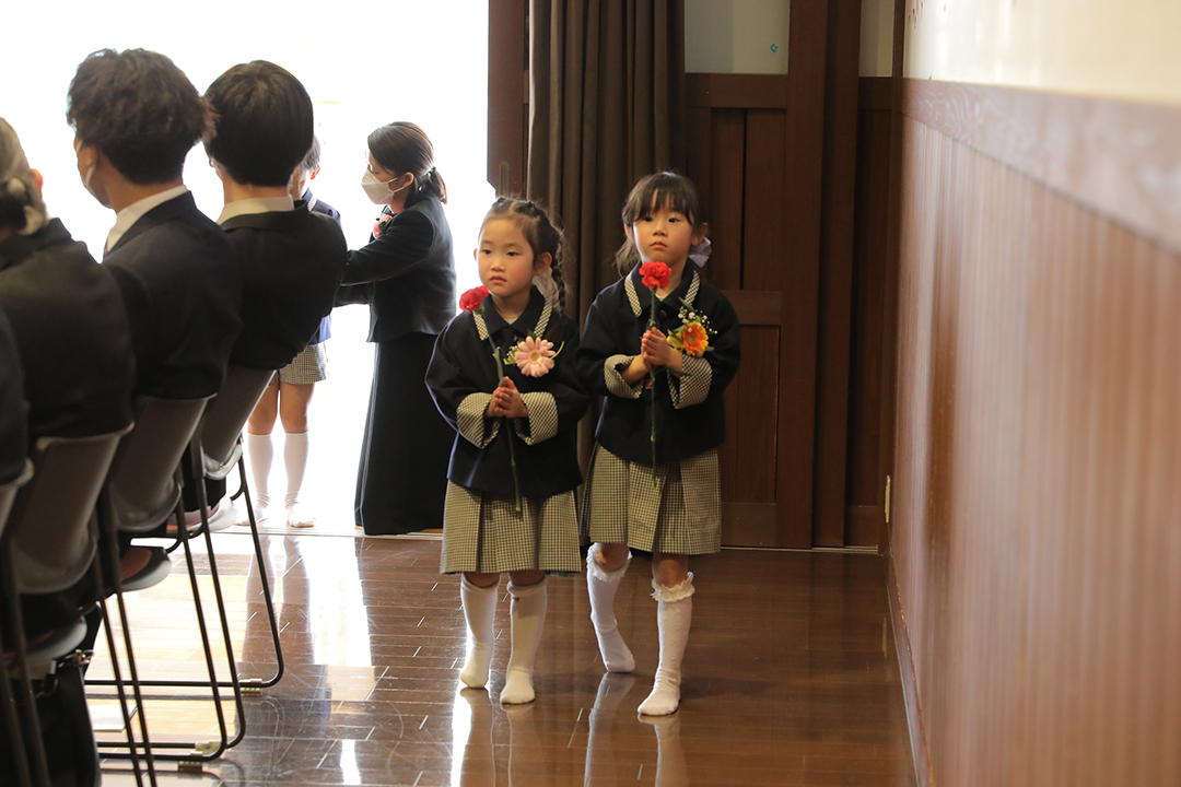 皆が拍手で迎える中、卒園児たちが「ありがとう」の気持ちを込めた一輪の赤いカーネーションを手に入場し、式典が始まりました。