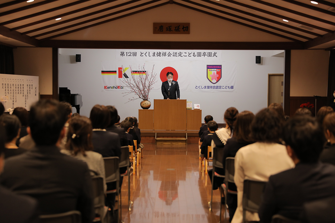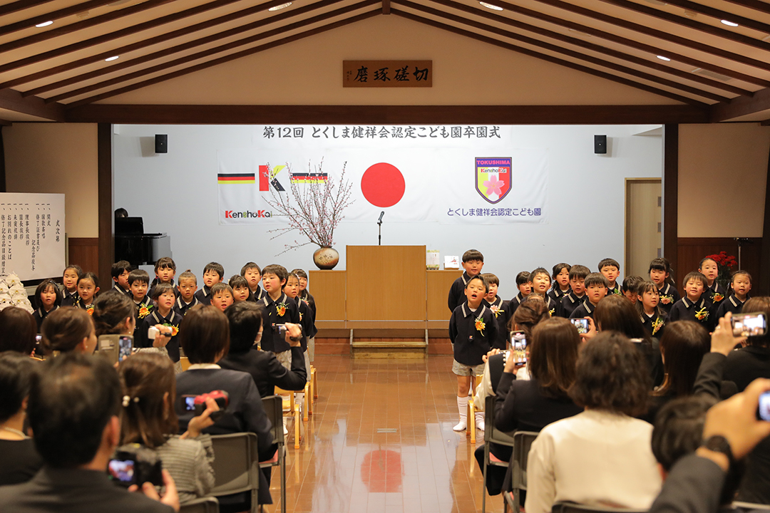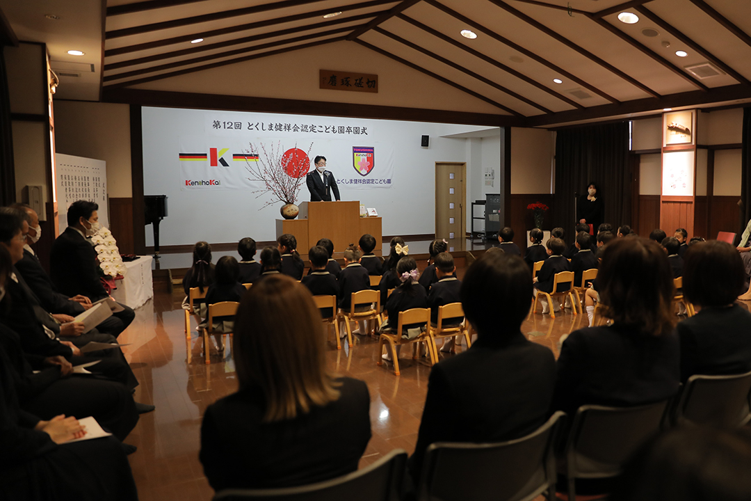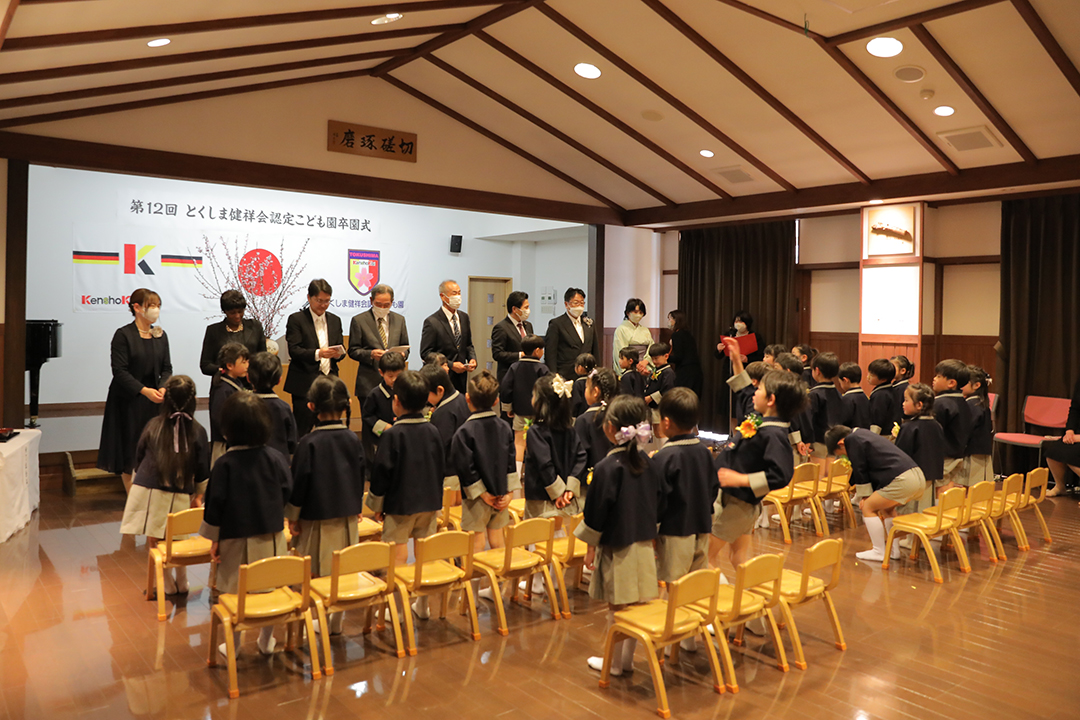 とくしま健祥会認定こども園では第12回目の卒園式が園舎2階の「礼儀と感謝の道場」で。ご来賓として、徳島県議会議員須見一仁様、八万地区社会福祉協議会会長 秋田孝様、八万地域安全安心推進会会長 森 優様、サイエンス・英語・音楽の各教室でお世話になった講師の先生方がお越しくださり、保護者の皆様も多数ご列席くださいました。