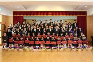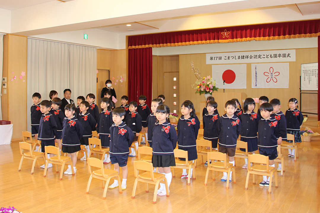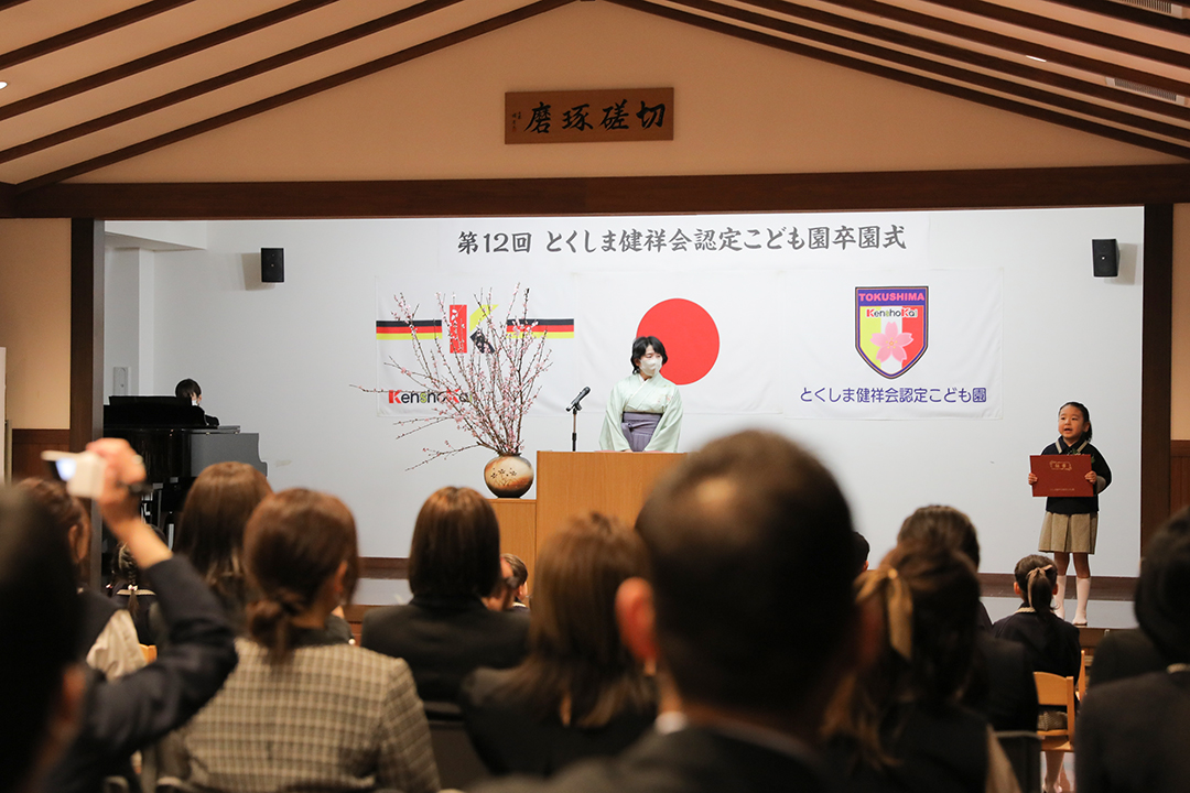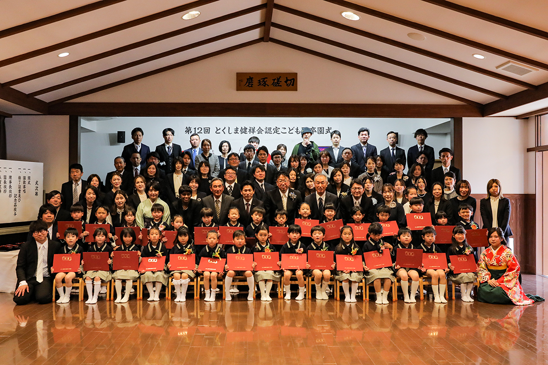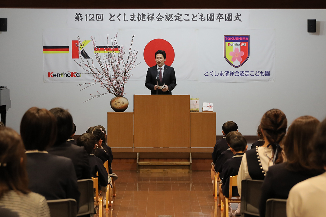 とくしま健祥会認定こども園では第12回目の卒園式が園舎2階の「礼儀と感謝の道場」で。ご来賓として、徳島県議会議員須見一仁様、八万地区社会福祉協議会会長 秋田孝様、八万地域安全安心推進会会長 森 優様、サイエンス・英語・音楽の各教室でお世話になった講師の先生方がお越しくださり、保護者の皆様も多数ご列席くださいました。