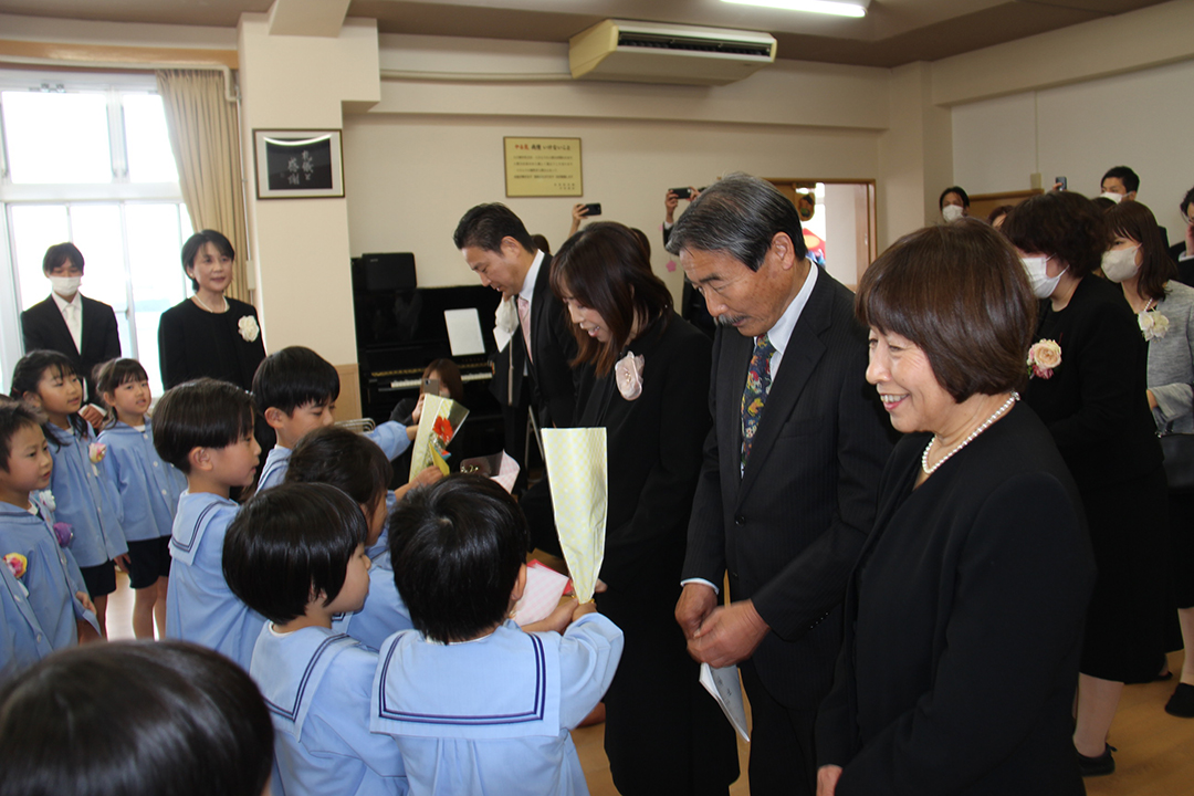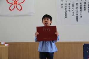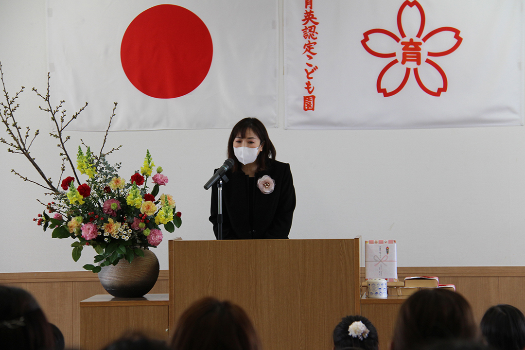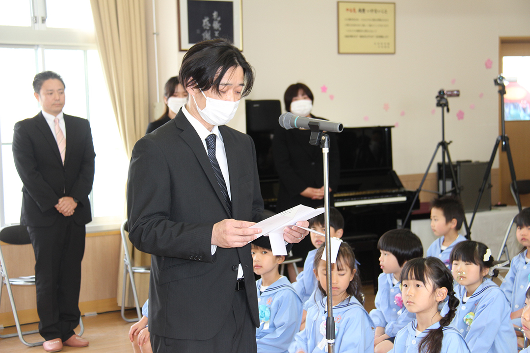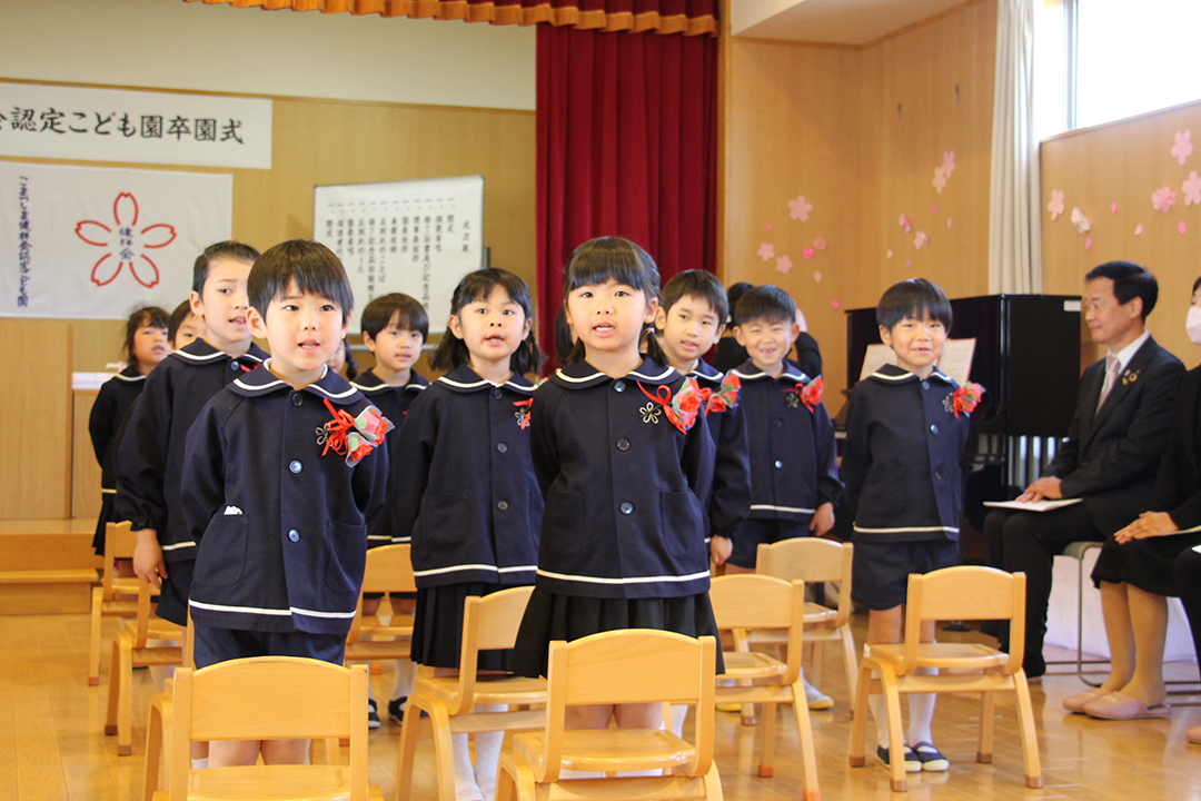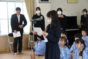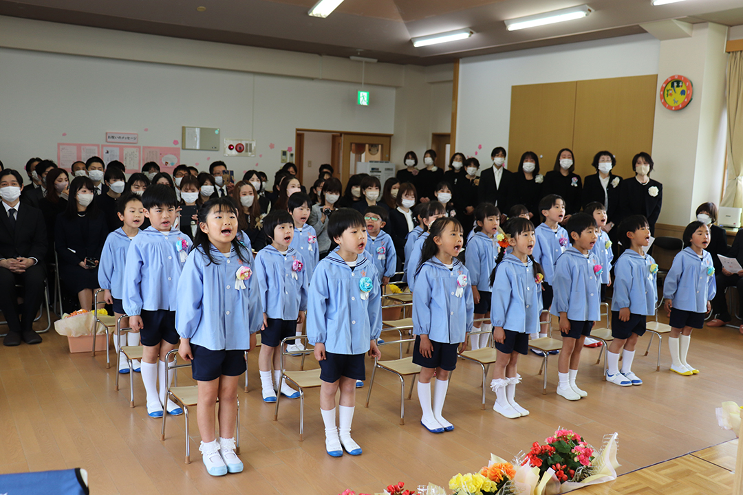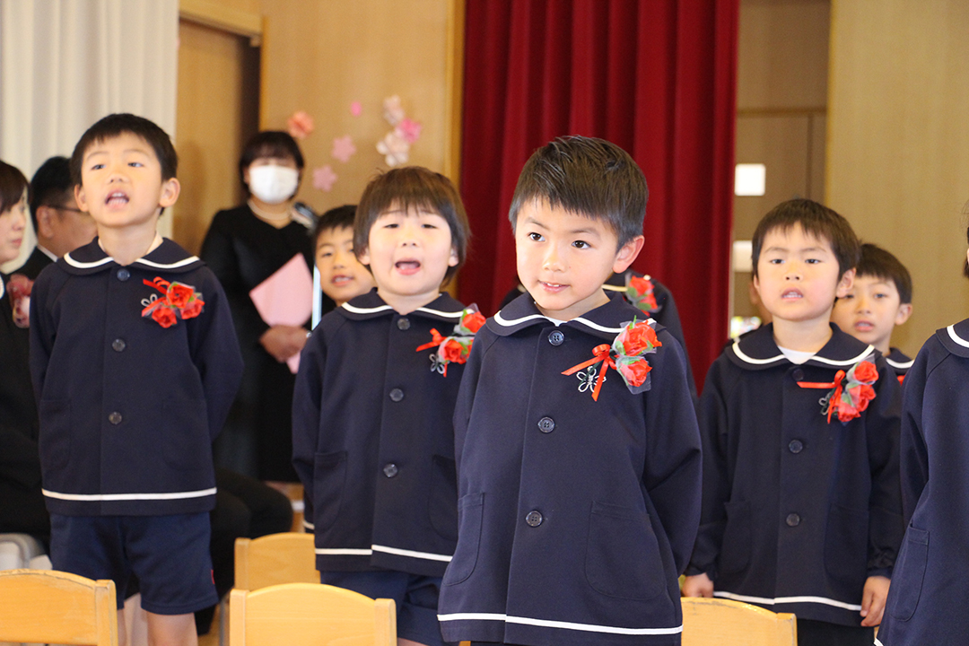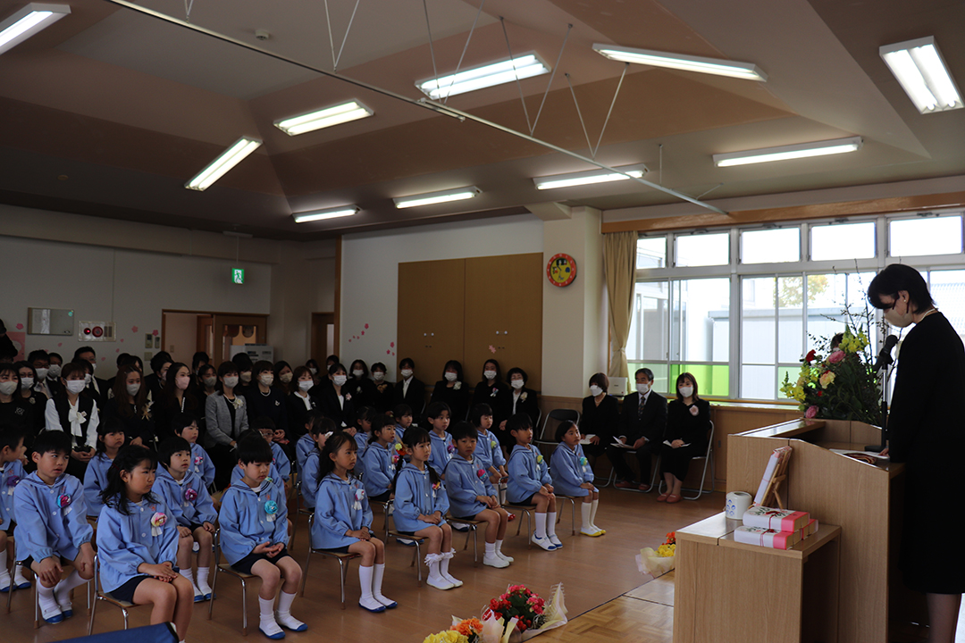 卒園児の皆さん、園での毎日には、コロナウイルスのために我慢しなければならないこともたくさんありましたが、今日はマスクを外した晴れやかな笑顔で多くの方に出席いただき、皆さんの立派な姿を見ていただくことができました。小学校に行っても元気で、たくさん遊び、たくさん学んでください。