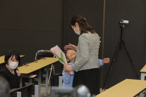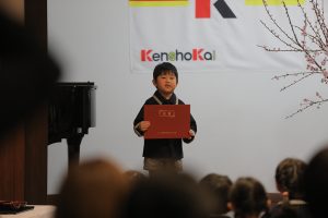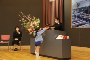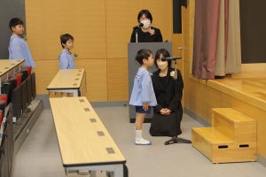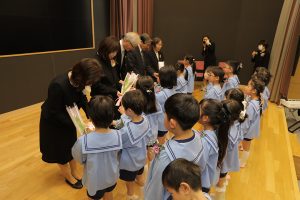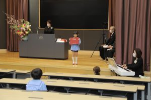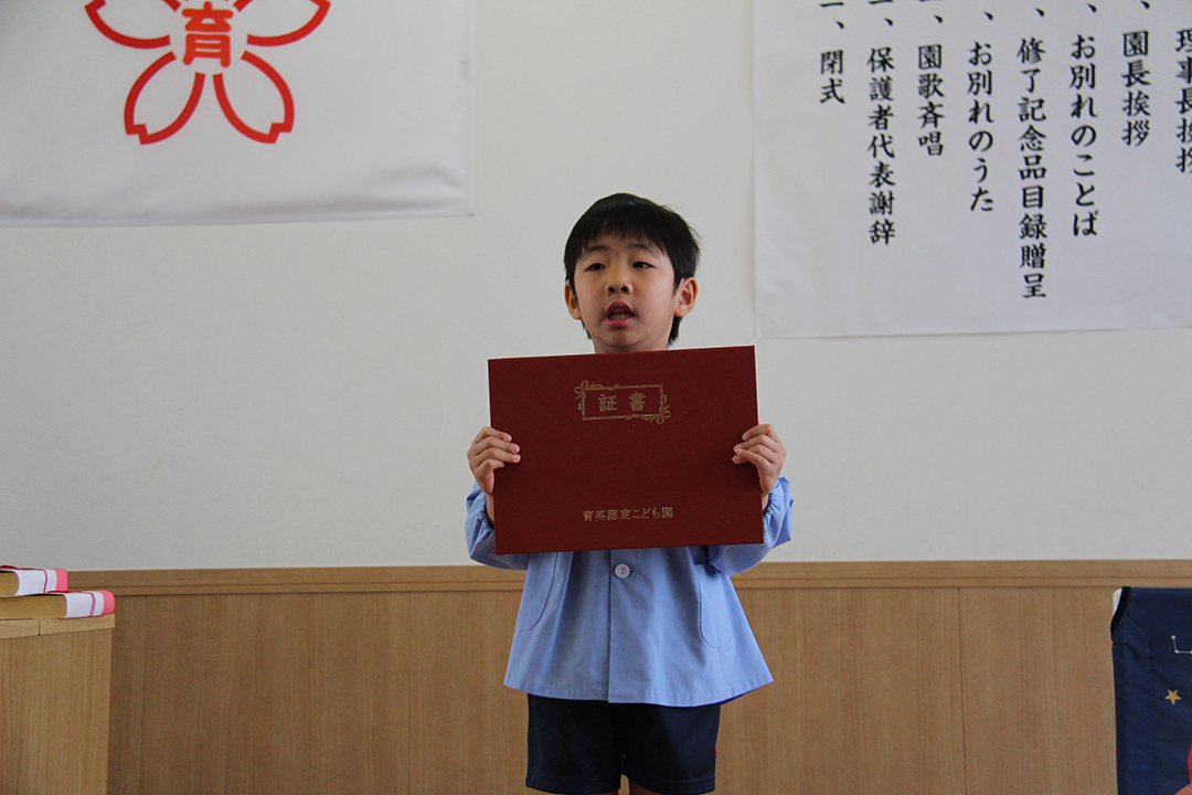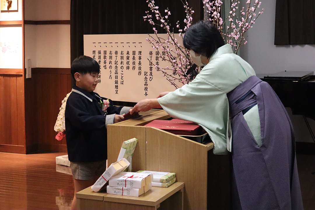 全員で元気に国歌を斉唱した後、31名一人ひとりの名前が呼ばれ、どの子も立派な態度で田中育美園長から修了証書と千宗室裏千家家元よりのお印を受け取りました。壇上で子どもたちが語ってくれた将来の夢は、サッカーやバスケットなどのスポーツ選手や保育士、ケーキ屋さん、警察官、看護師、アイドル、ホテル王、建築士、美容師など本当に様々。ウイルスを研究する人という時代を象徴する夢も登場しました。