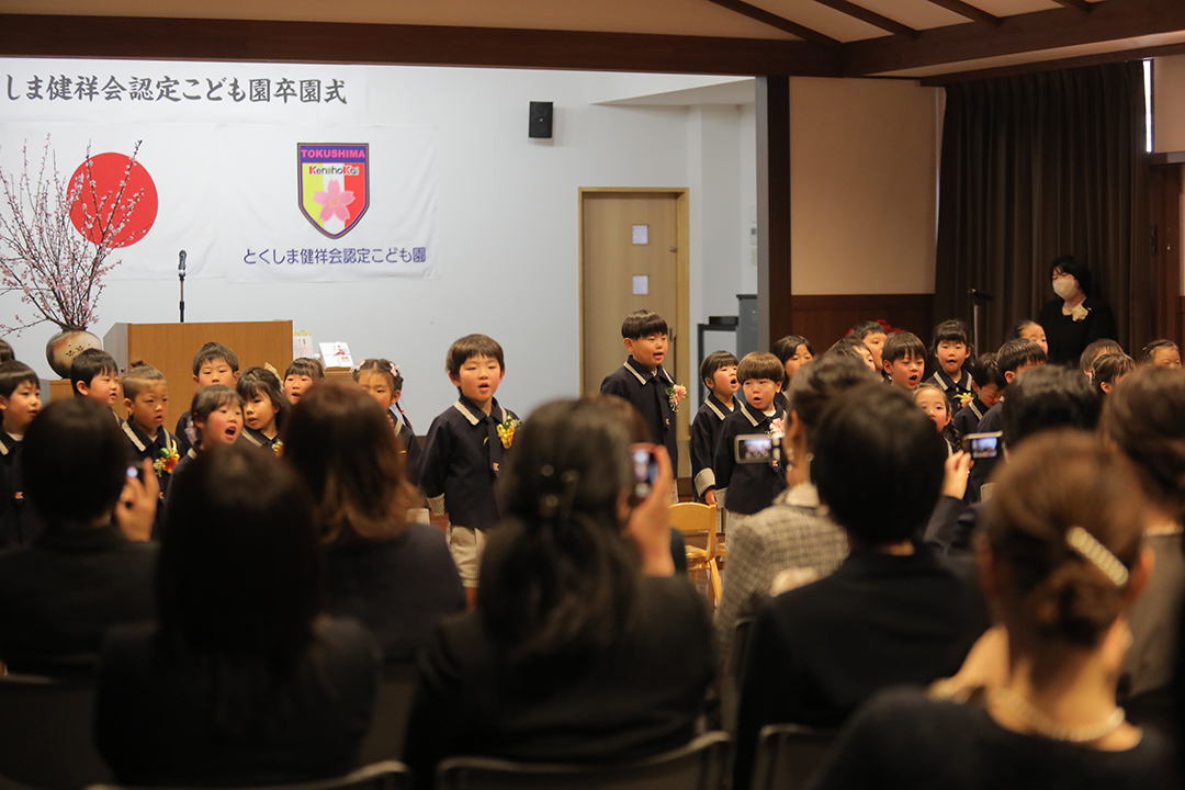 桜の開花の声が待たれる3月16日、23日の両日、健祥会グループ4つの認定こども園で卒園式が行われました。育英認定こども園、とくしま健祥会認定こども園、こまつしま健祥会認定こども園は自園で、青嵐認定こども園は、健祥会グループ本部の健祥会トゥモローホールを会場に行われました。