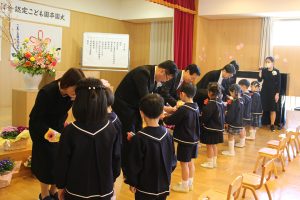 保護者の皆様には、これまでさまざまなご苦労があったことと思いますが、お子様を通じて多くの方と結ばれた絆をこれからも大切にしてください。こども園での経験や思い出が子どもたちを支えてくれると思います。お子様の健やかな伸びやかな成長をお祈りいたしております。