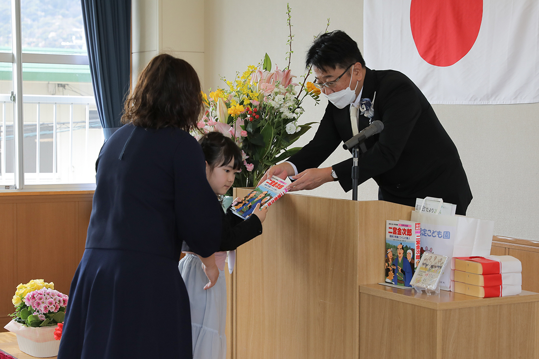 入園を記念して理事長から贈られた「二宮金次郎」の絵本は、ご家庭で、親子で、ともに読んでいただきたい一冊です。