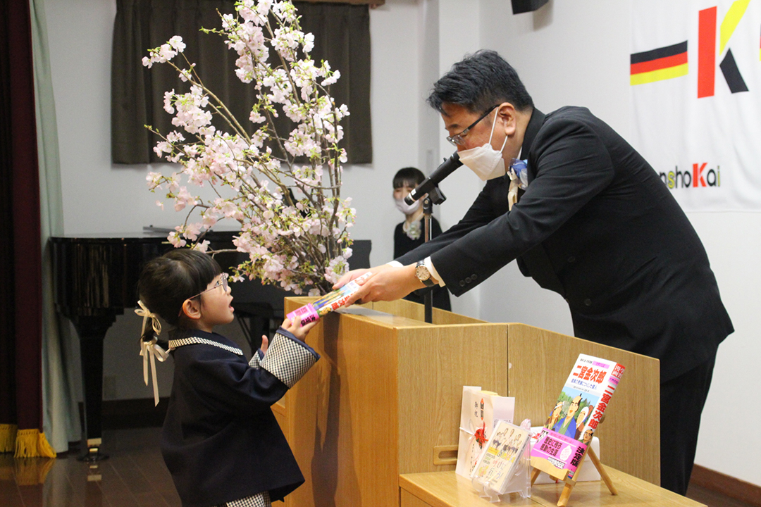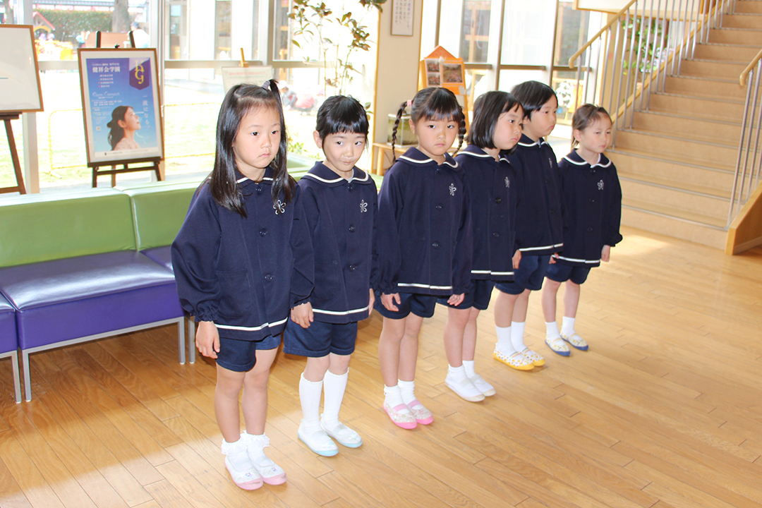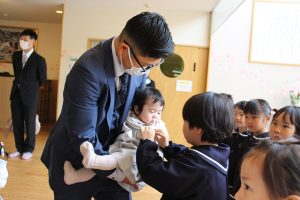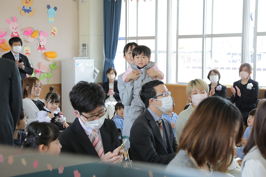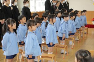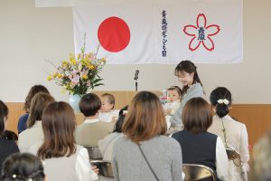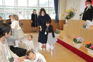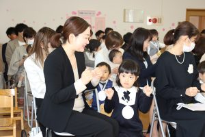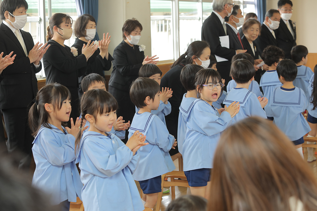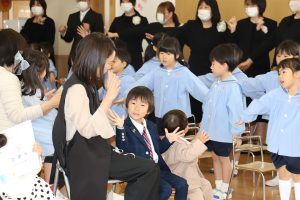 新しい友だちを歓迎し、在園の5歳児たちが元気いっぱいのメッセージや二宮金次郎の歌、チューリップの歌やむすんでひらいての手遊び、園歌「あしたを呼びに行こう」を披露。新入園児も見よう見まねで手振りをしたり、リズムをとったり、微笑ましい姿を見せてくれました。
