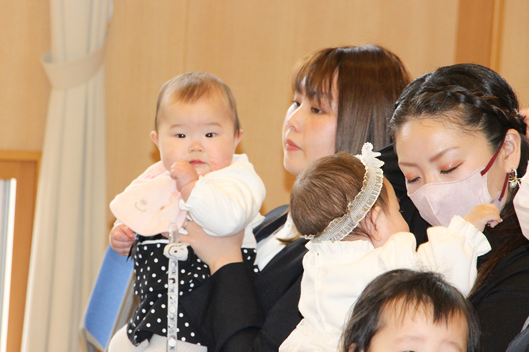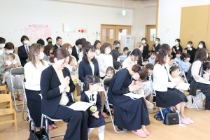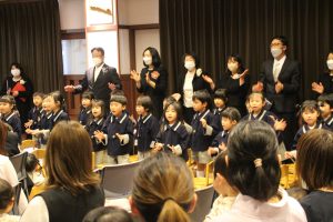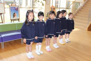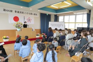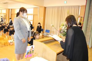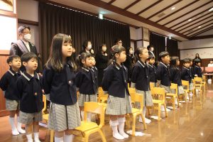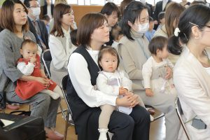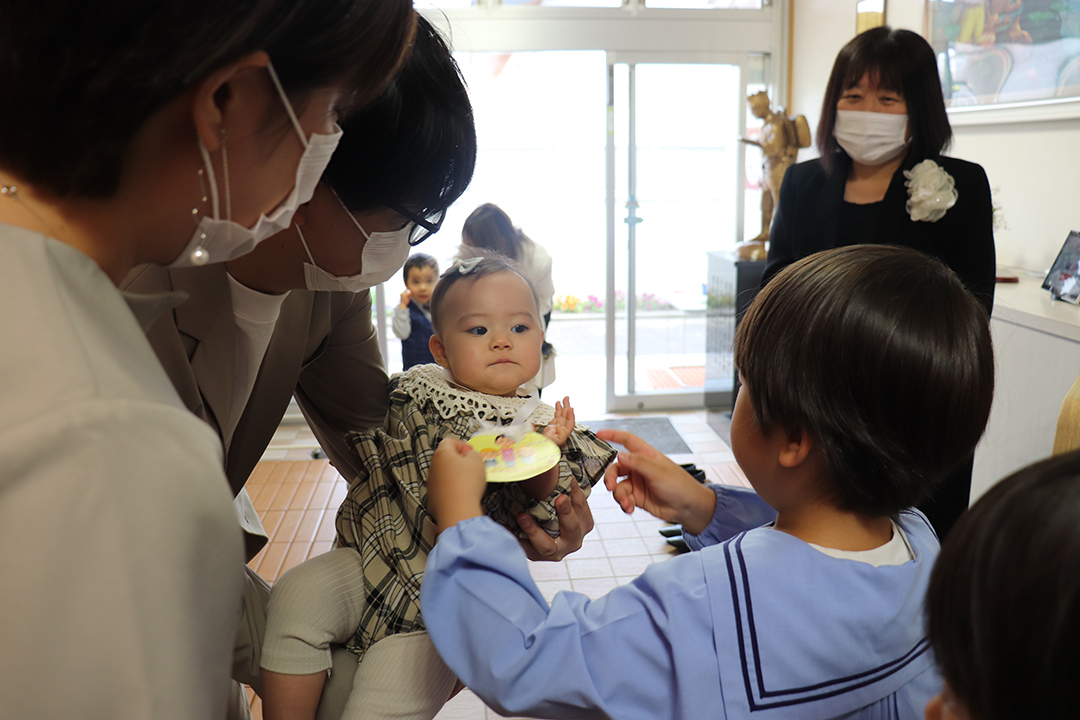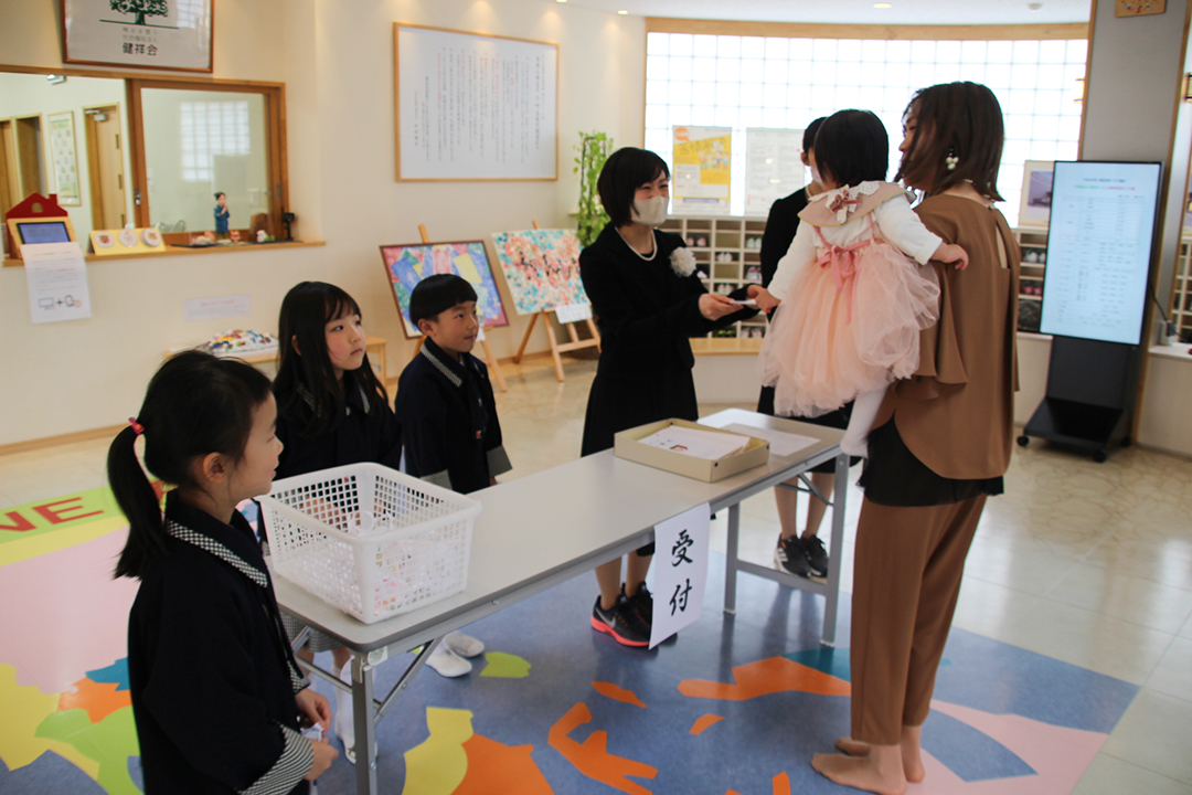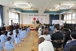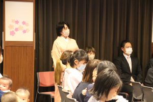 新しい友だちを歓迎し、在園の5歳児たちが元気いっぱいのメッセージや二宮金次郎の歌、チューリップの歌やむすんでひらいての手遊び、園歌「あしたを呼びに行こう」を披露。新入園児も見よう見まねで手振りをしたり、リズムをとったり、微笑ましい姿を見せてくれました。