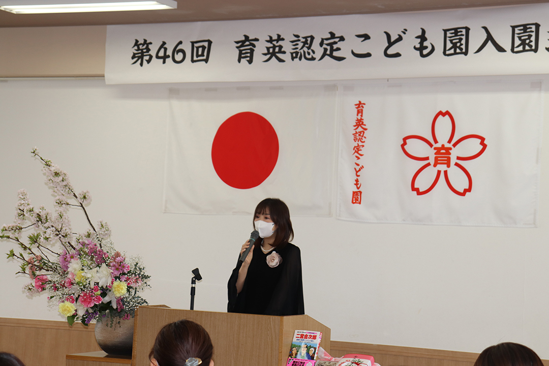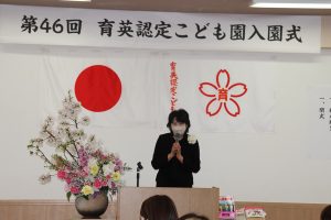 新入園児の皆さん、皆さんに会うことができて本当に嬉しいです。こども園には楽しいことがいっぱいです。毎日元気に遊び、たくさんお友だちをつくってください。