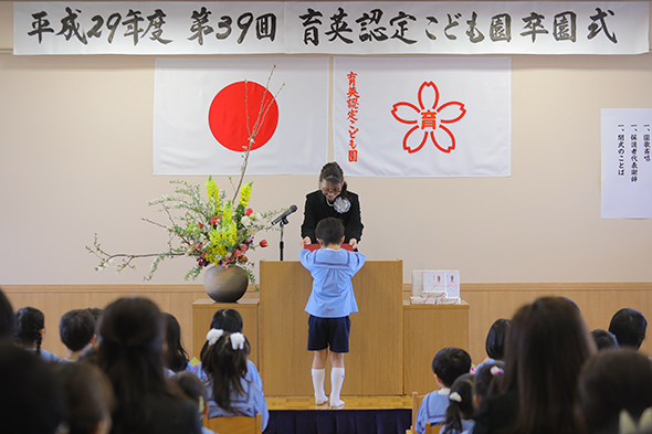 春の日差しの注ぐお遊戯室で行われた「一人ひとりが主役の卒園式」。担任の保育教諭が名前を呼んで、一人ひとりを紹介。園児たちは元気よく返事して、園長から卒園証書と千宗室裏千家家元よりのお印を受け取り、将来の夢を発表しました。お医者さん、ゲーム屋さん、スノーボードの選手、絵描きさん、車屋さんなど、いろいろな夢が飛び出しました。