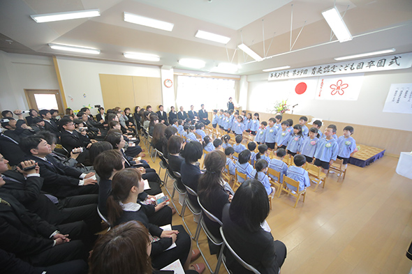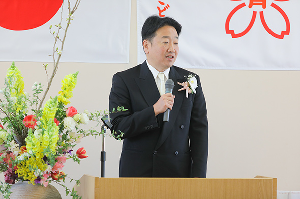 また保護者の方々に祝意と感謝を表するとともに、「育英認定こども園は、育英保育園として健祥会グループの中でいちばん最初に設立された施設であり、ここからグループの歴史がスタートしました。人としての基礎がつくられる幼児期の教育こそが何より大切との思いで開園し、質の高い就学前教育を実践してきました。4園でずっと受け継がれ続けてきたこの理念を大切に、今後も保護者の皆さま、地域の皆さまにますます喜び親しんでいただける園にしてまいります」と語りました。