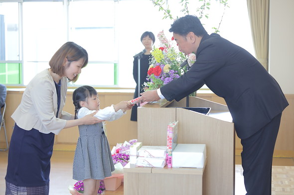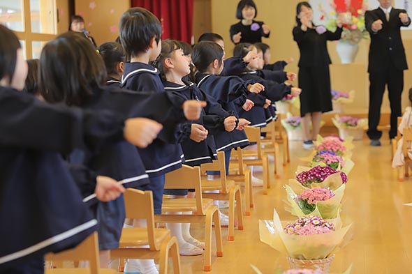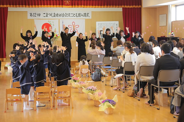 小松島市長 濱田保徳様よりの祝文と来賓の皆様が紹介され、続いて、最年長となった5歳児金次郎組の園児たちが新しい友だちの仲間入りをお祝いしてメッセージや二宮金次郎の歌、園歌「あしたを呼びに行こう」を披露。手遊び歌は、入園児たちもいっしょに楽しみました。