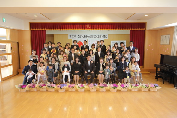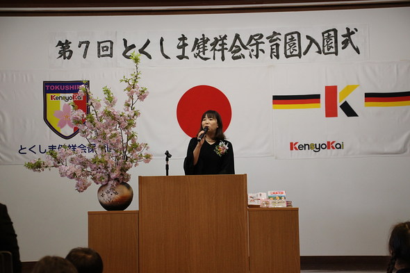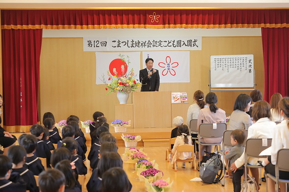 4日、こまつしま健祥会認定こども園。ご来賓として、苦情解決第三者委員・小松島市会議員 杉本 勝様、体操教室専任講師 岡村邦子様、サイエンス教室専任講師・徳島大学大学院教授 安野 卓様、音楽教室専任講師 高瀬久美子様にお越しいただき、第12回目の入園式が行われました。